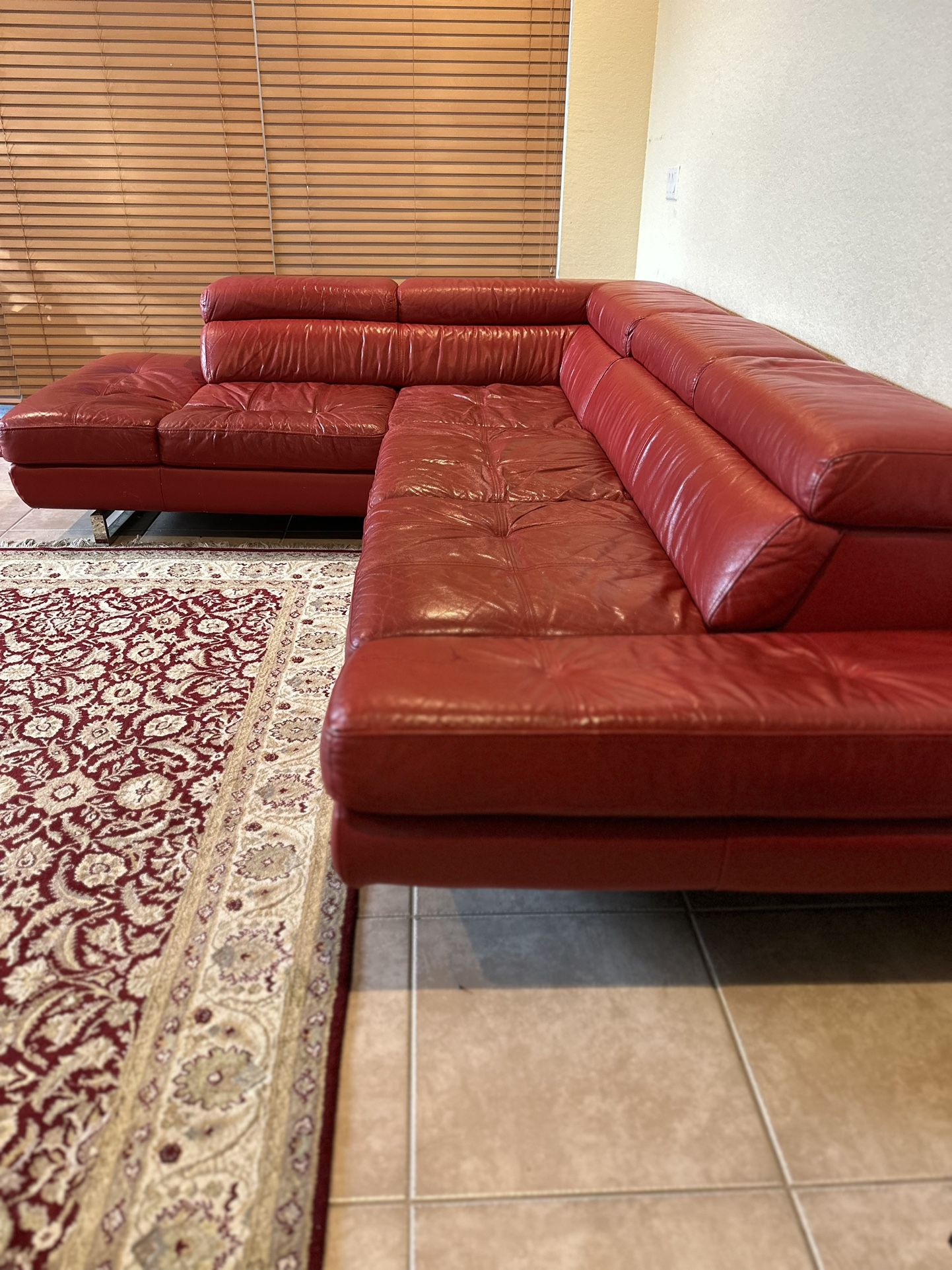 These are premium sofas made from Italian leather. Changing them up so selling these. Leather shows sign of wear but that’s what happens with premium leather. There are no rips or cut parts in the leather anywhere, as real leather is very durable. Sofa can be split in two pieces so easy for transporting if you bring a truck. Head rests move up and down at three places as shown in pictures and also a rest at the corner of the sofa moves up and down, once again, as seen in the pictures. One of the seats towards the back, the base is a little loose or broken, so sitting on that seat feels a little lower, but I’m sure it can be fixed.