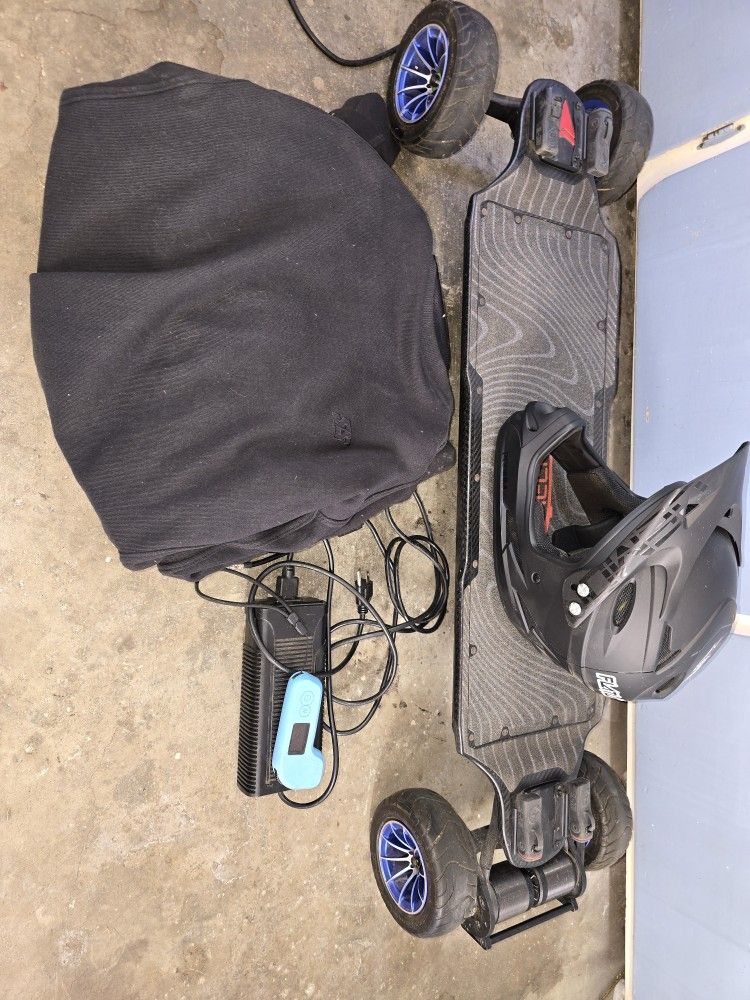 827 miles. Comes with charger, remote, brand new all terian tires pnumatic. New riptide bushing and zelous bearings. Also have a full face helmet pads and a set of cloud wheels. Padded sweaters and shorts included