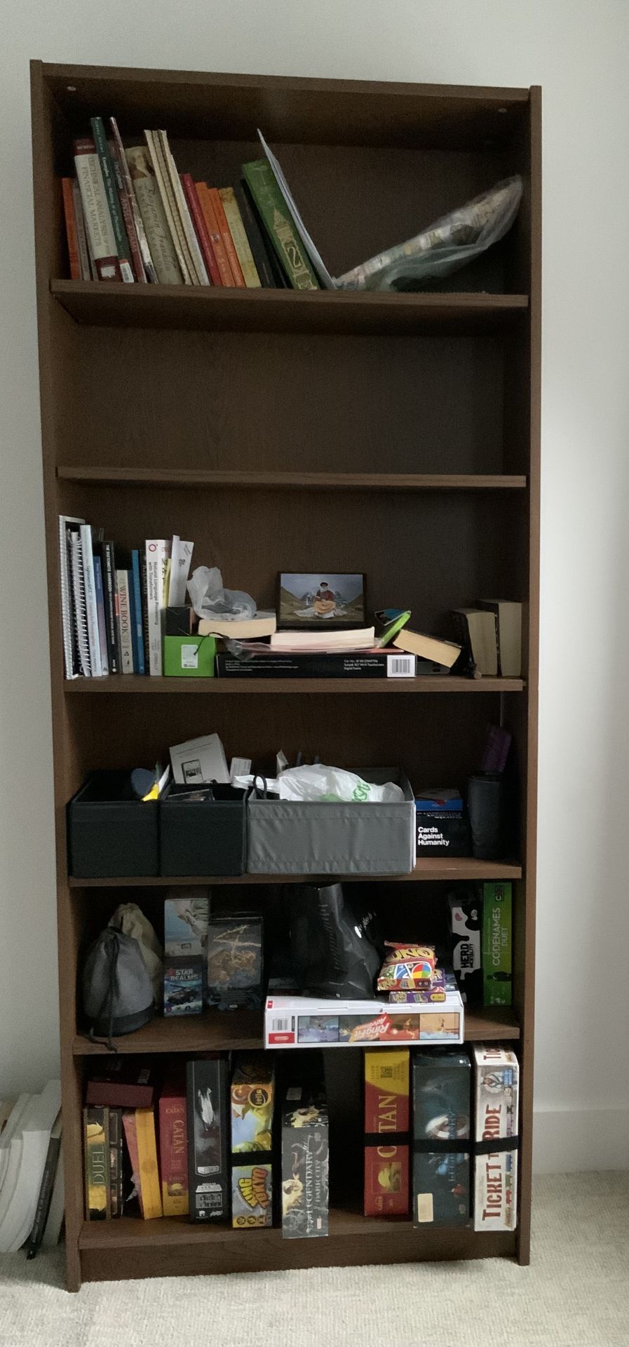 Sturdy and spacious wooden bookshelf in great condition Perfect for organizing books, board games, storage bins, decor, etc. 6 wide shelves for plenty of storage Solid build - stable and durable Neutral wood finish, ideal for living room, office or bedroom Height 79” Width. 32” Depth. 10”