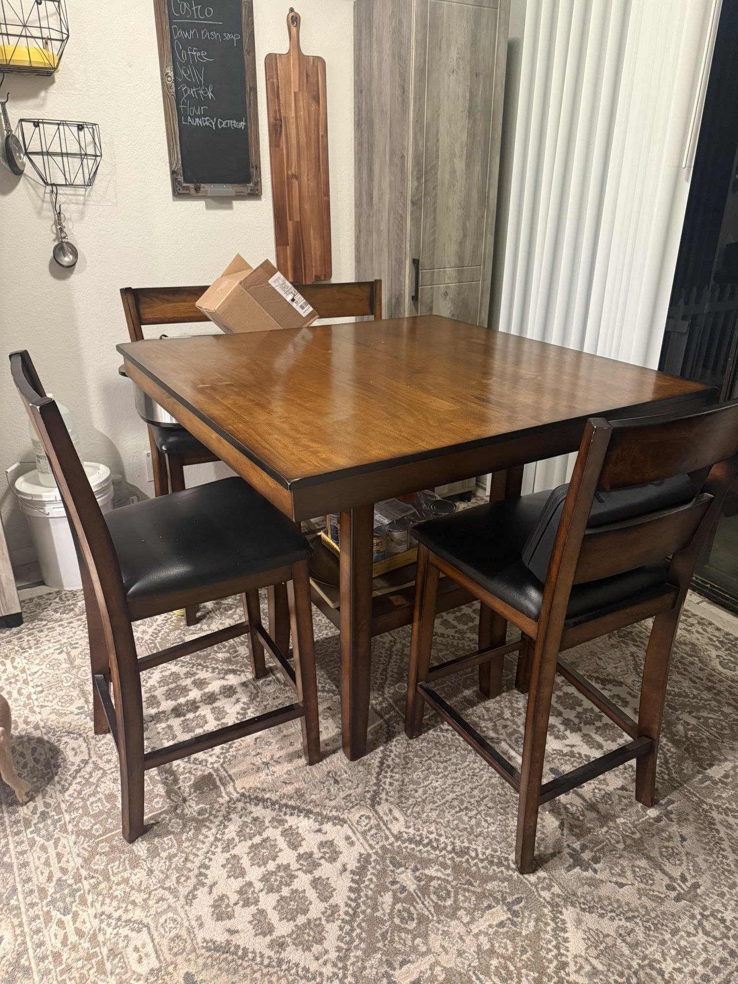 Used. Normal wear and tear. Counter height table. Square. 4 chairs included MUST GO TODAY!! 2.15.26