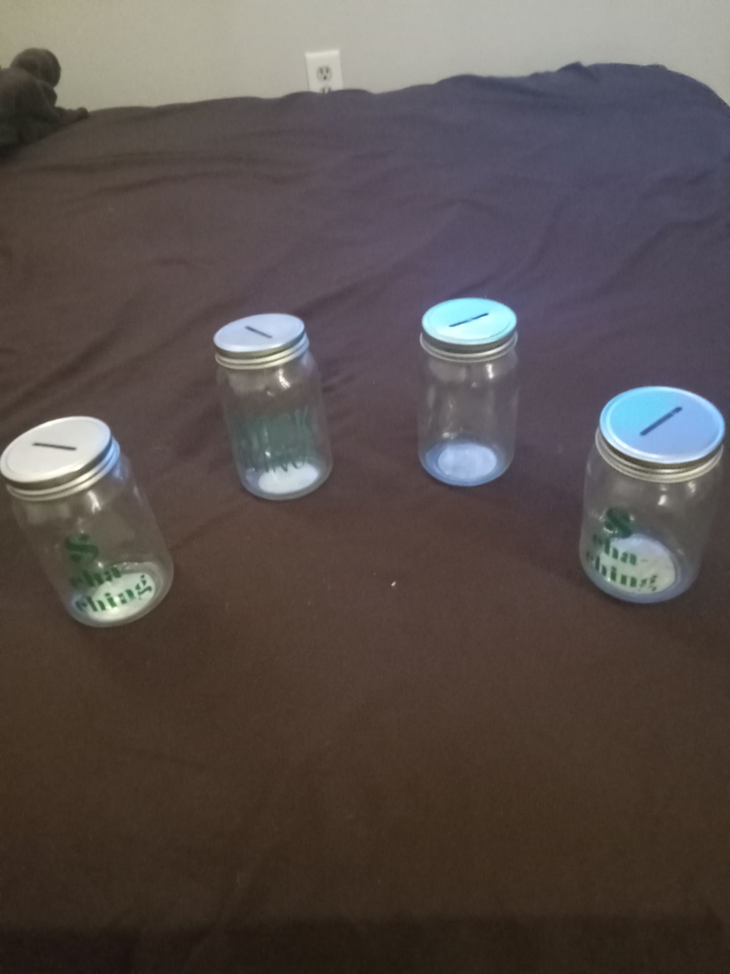 Keep your coins safe in these jars! "Cha ching" "Snack savings" $20/for all or $10/each