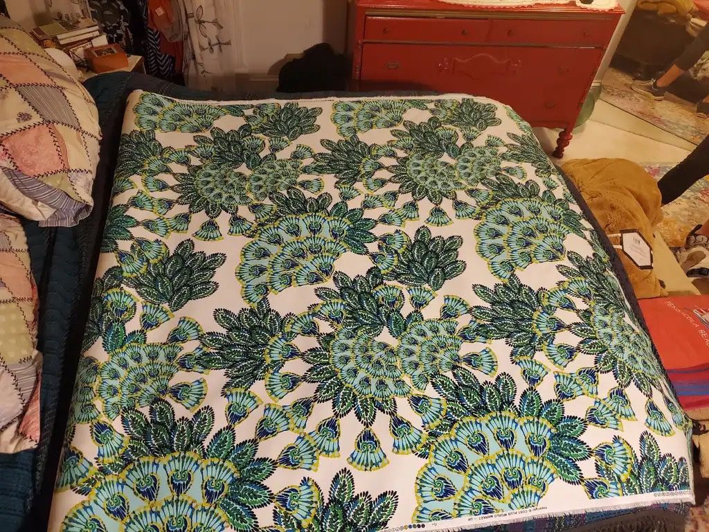 Beautiful vibrant green and blue floral design fabric. Bought it to use as wallpaper, but it was the wrong size. Great option for renters and/or short-term wall decor as it is easy to remove without traditional wallpaper glue residue. Dimensions: 76×55". OBO