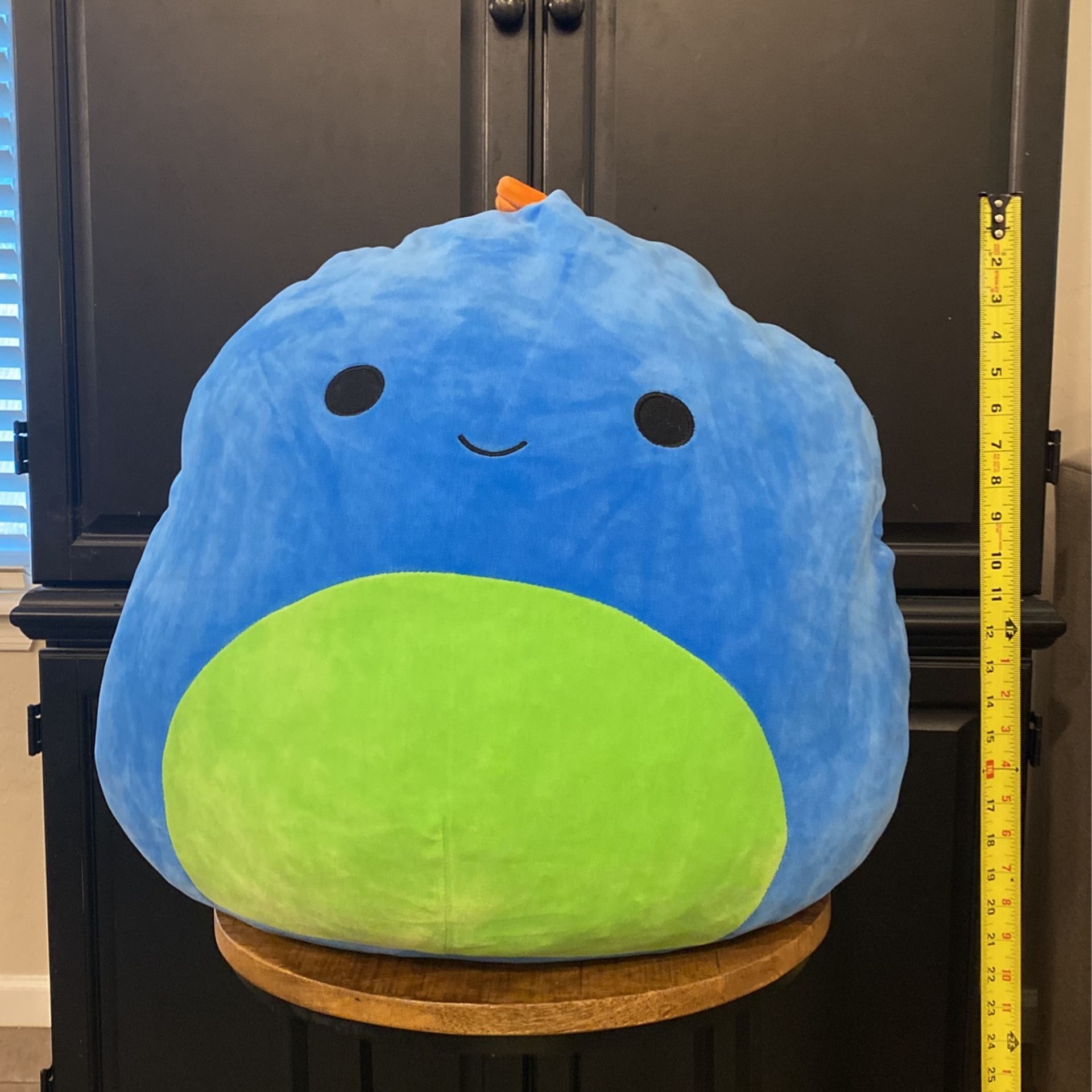 OPEN TO OFFERS - Roughly 20 inch diameter all around. Squishmallow brand. Clean and in good condition. Light use. Blue body with green belly spot, orange detailing down back, and black face details. Very squishy and soft. Character is Darex the Dinosaur.