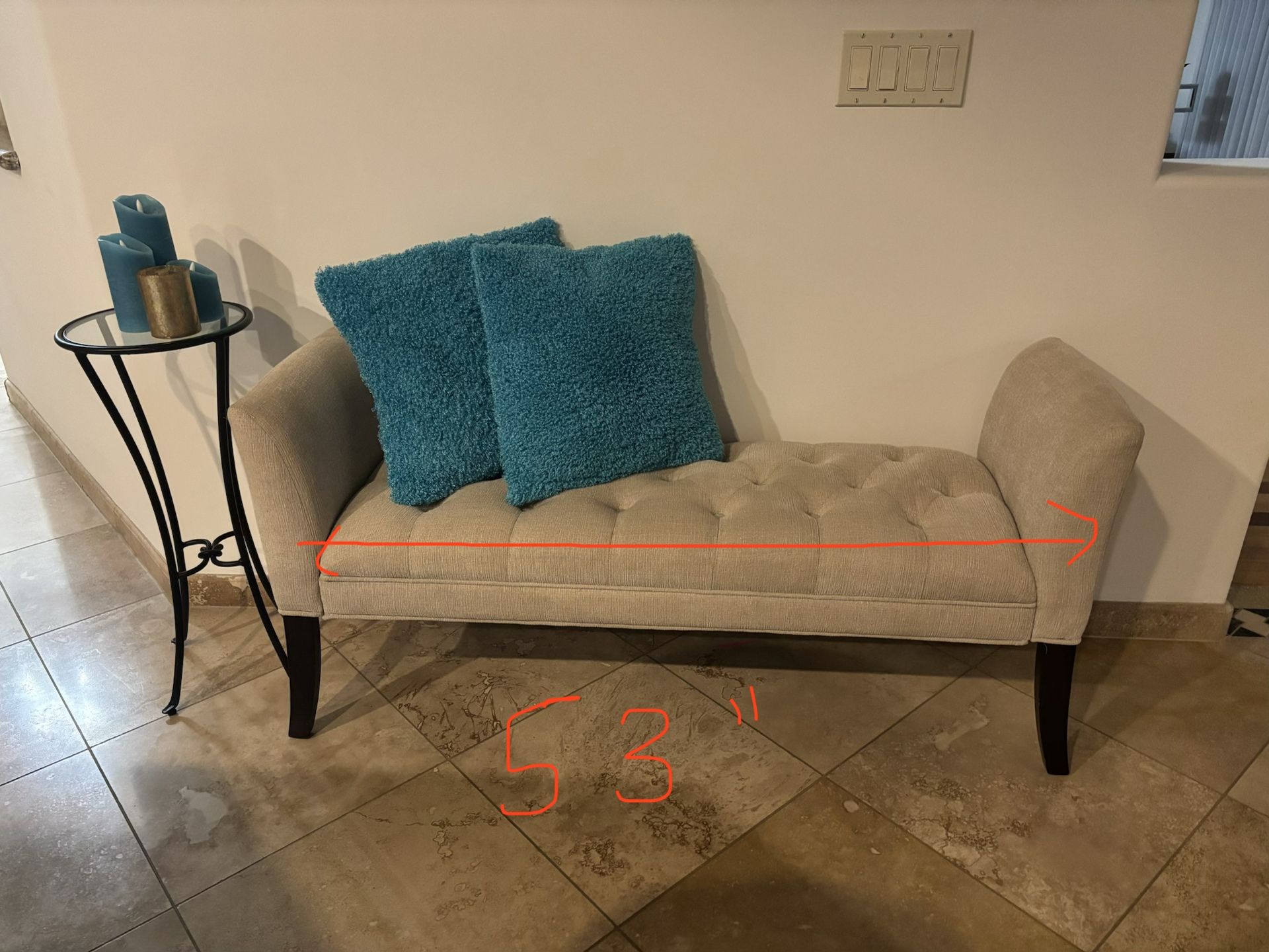 Cream bench with black legs and black side table. Thick seat pad and armrests. Very comfortable