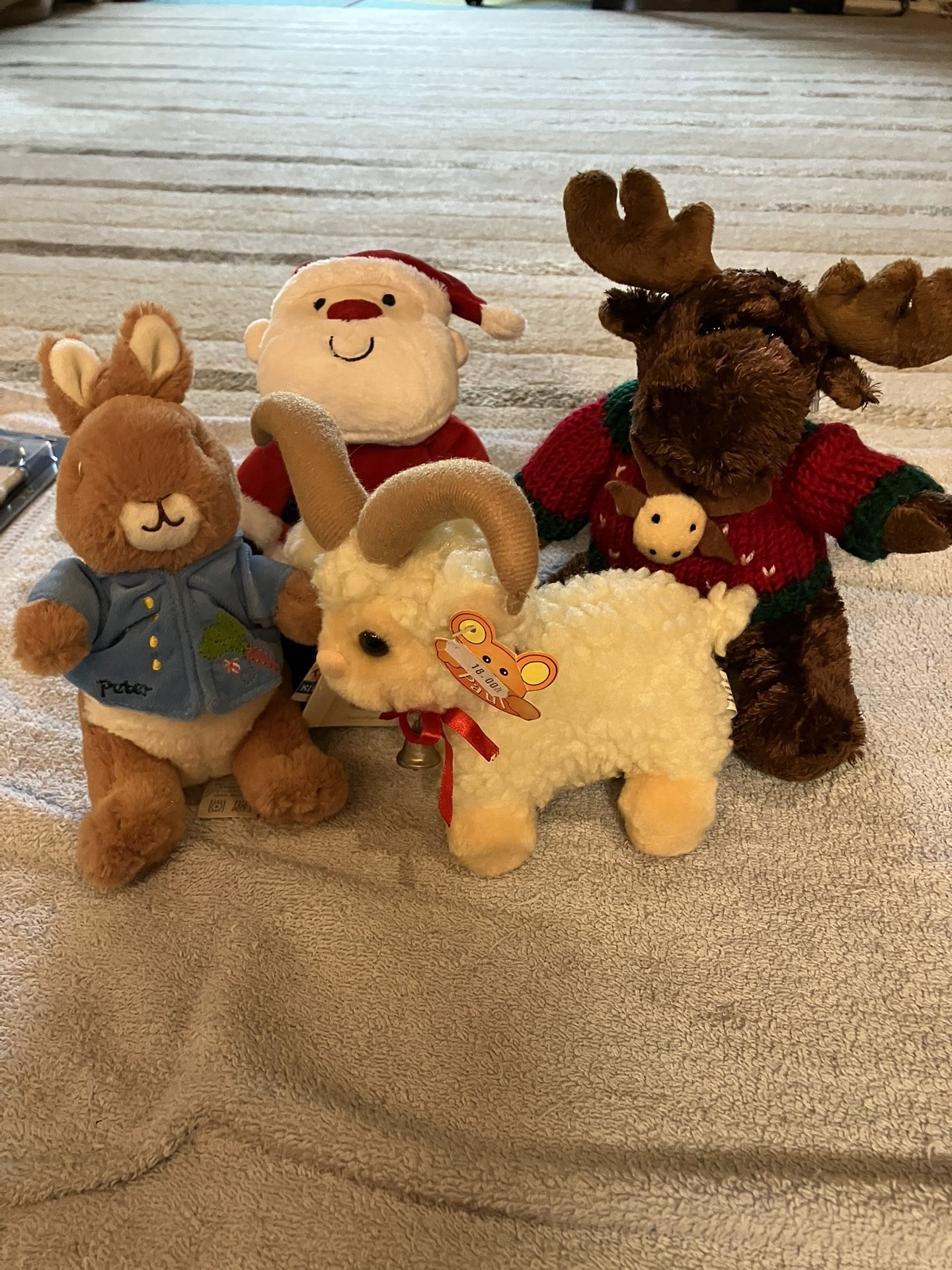 4 Stuffed Animals Peter rabbit, Santa, Moose And Goat!