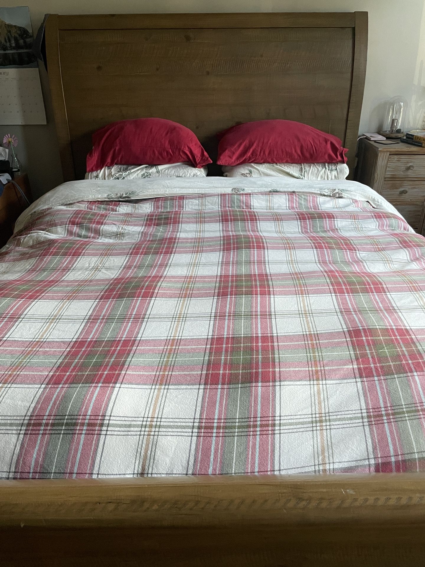 Queen sleigh bed, with intentional, rustic distressed wood; tall headboard Comes disassembled Requires boxspring (included for free, if interested) 66.5 inches wide 58 inches tall (headboard) 94.5 inches long