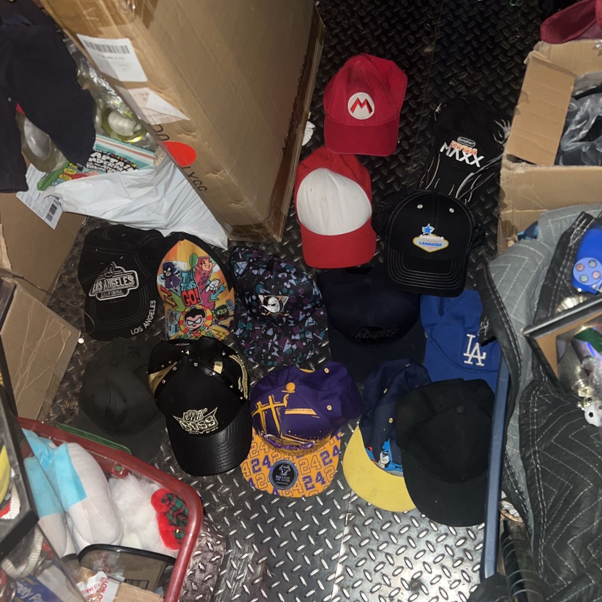 Dodgers hat $8 Lakers hat $5 Lakers legend hat $20 the legit boss $9 teen titans $4 Los Angeles black hat $5 Landstar hat $7 Mario hat $5 Dyna hat $5 white and red hat $7 Adidas hat $10 Hockey hat $8 Plain black hat $7 2 for $10 ,depends on which hat