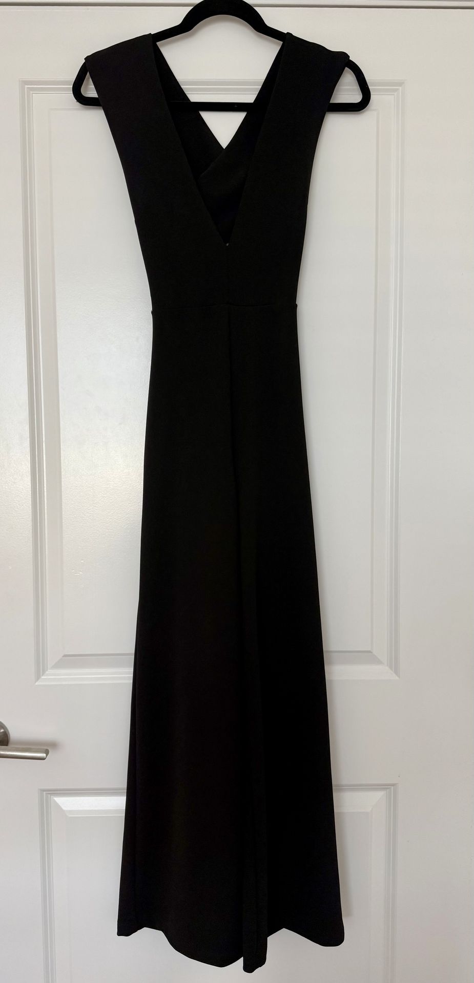 Black Jumpsuit With Plunge Neckline, Criss Cross Back, & Wide Leg. Stretchy Material - 95% Polyester, 5% Spandex. Small Snag On Left Leg. Size: XS/0. Bust: 31”-32”. Waist: 24"-25". Hips: 34"-35".