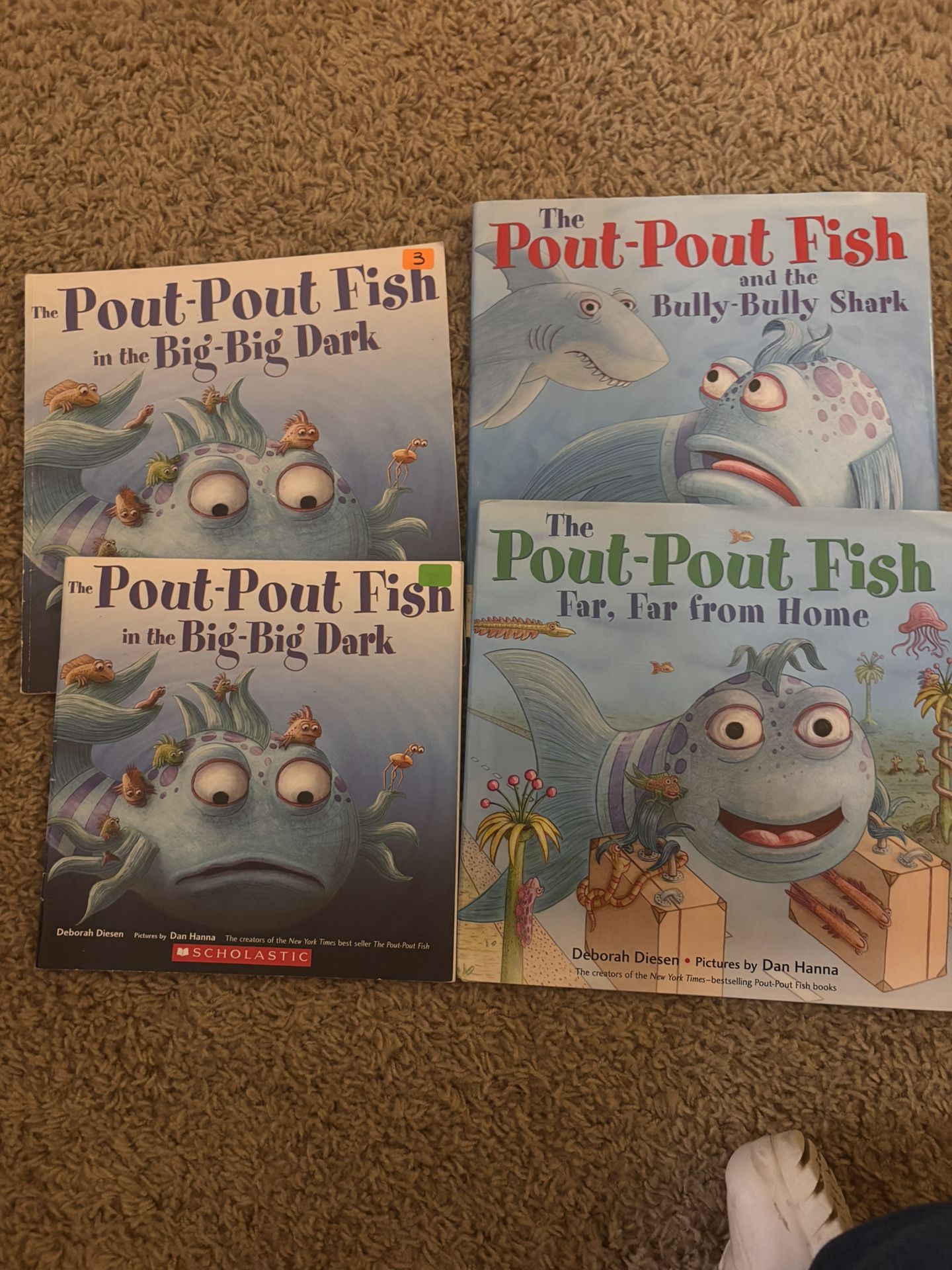 2 Pout pout fish in the big big dark books and two other Pout Pout fish hardback titles. Hardback book retail 17$ each.