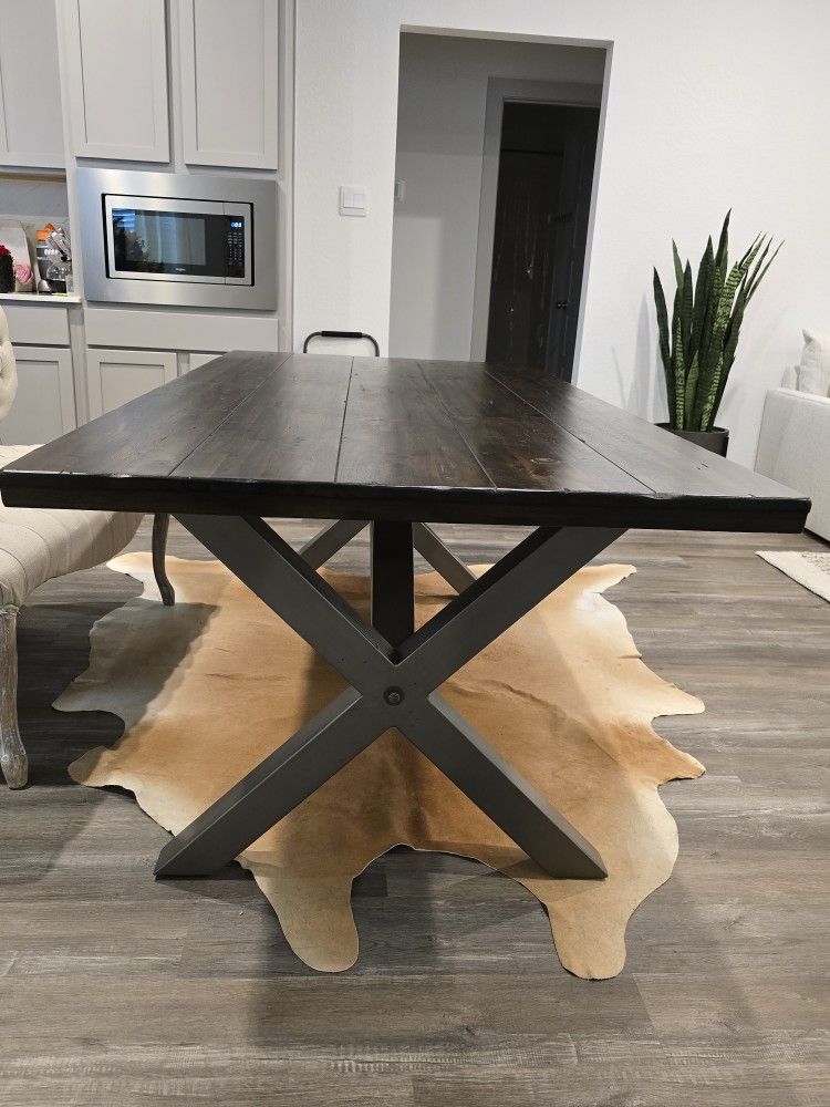 Rustic wood Dining table with gunmetal silver base. L 80"x W 40"x H 31.5".