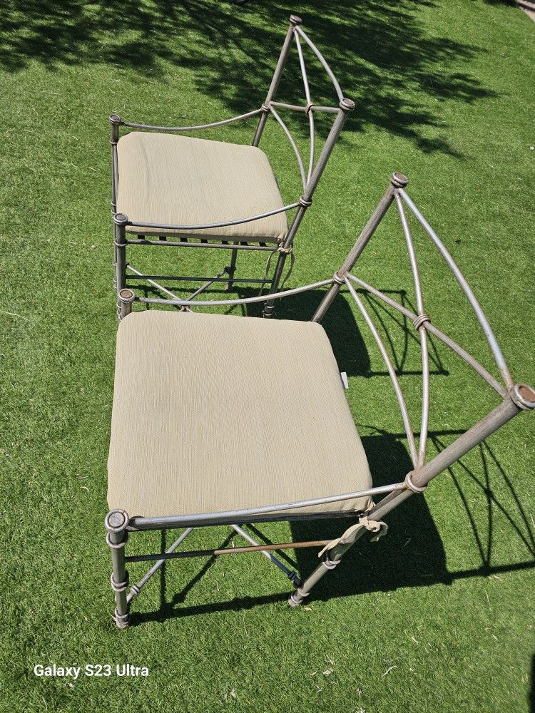 2 hand forged wrought iron counter height stools with outdoor cushions.