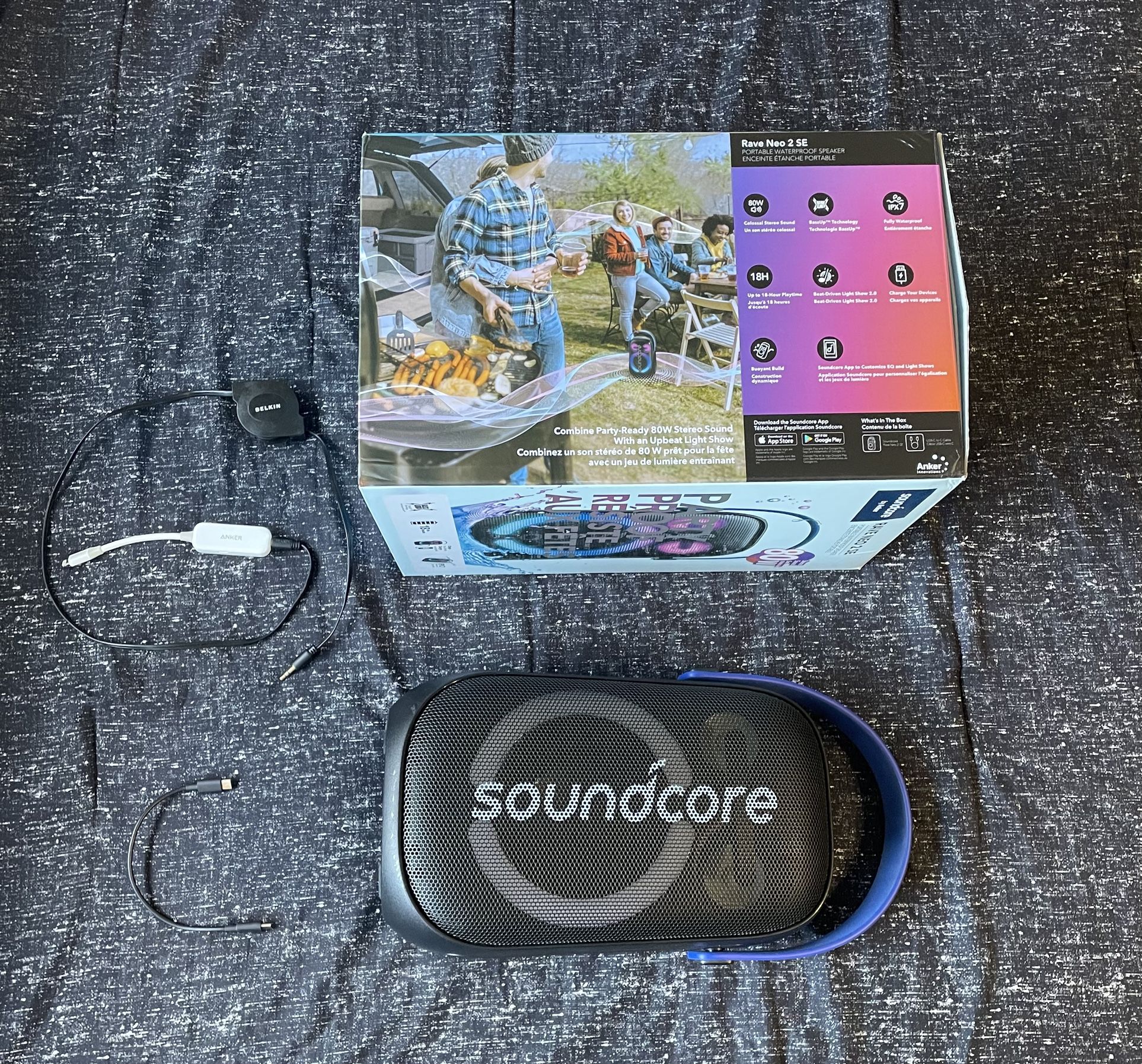 80W Soundcore Rave Neo 2 w/bundle! PartyCast bluetooth speaker by Anker, BassUp and 3.5mm aux + USB-C. Anker Lightning (iPhone, iPad) + 3.5mm adapter!