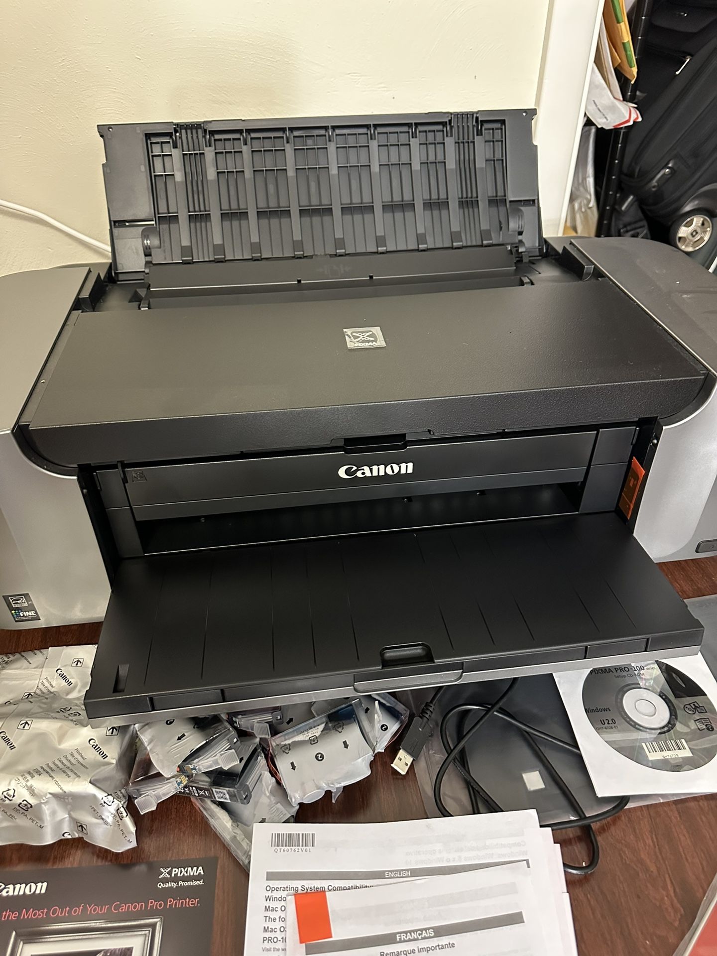 Canon PIXMA PRO-100 photo printer, maximum size 13 x 19“. Printer is three or four years old, but has never been used. includes complete set of original ink cartridges, never installed in printer. Complete constructions, including CD instructions. Includes four sample containers of different type 8 x 10 photo paper and one box of 50 sheets Canon photo paper pro luster size 13 x 19.