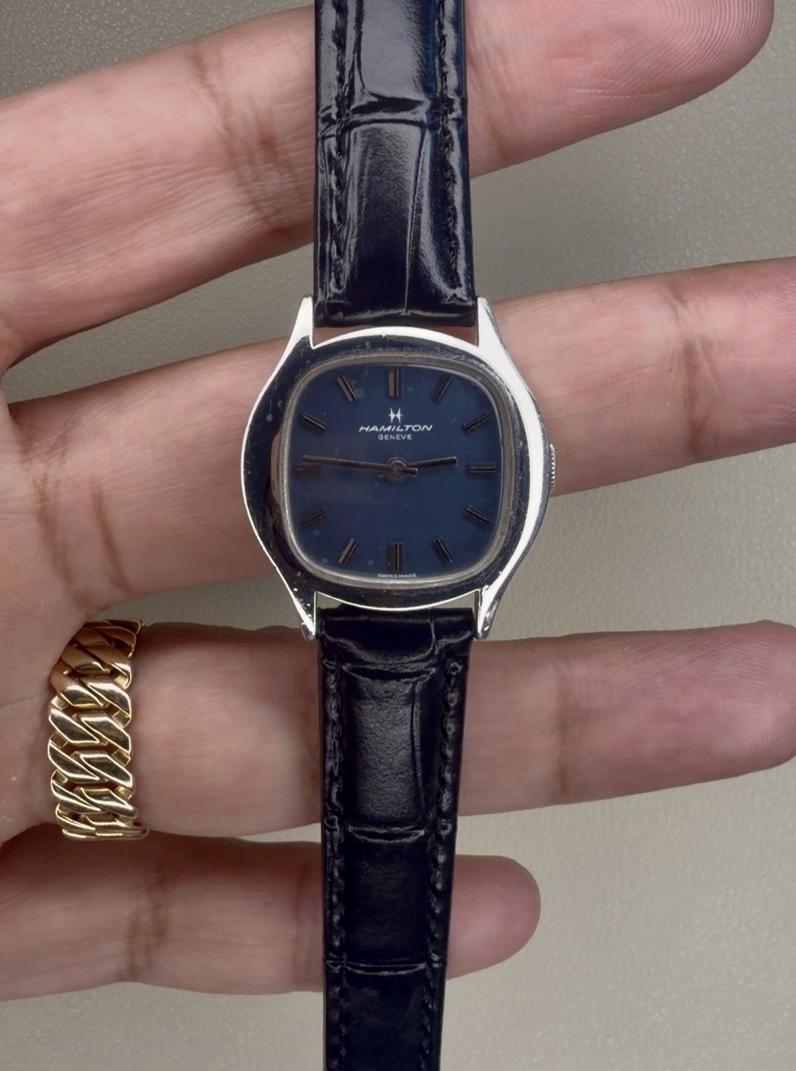 Ladies Hamilton Geneve - White Gold Plated - $167 -Details: A beautiful vintage ladies Hamilton Geneve with a cushion white gold plated case, blue dial, time only function, manual wind movement, and new black leather strap. Has light signs of wear but in overall great condition! Runs perfectly and accurately. Modeled and inspired after the Patek Ellipse of the 70’s, this Hamilton makes a great gift or is for any lady looking for something special and unique to add to their collection! -Price: $167 -Case size: 25mm -Movement: Manual winding -Location: Downtown Los Angeles