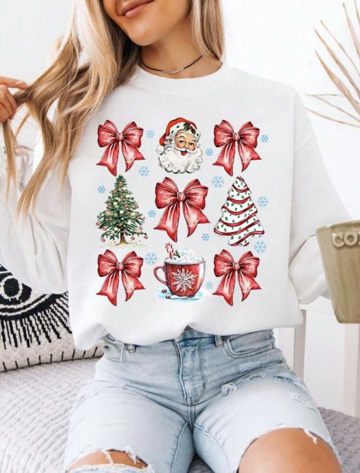New Festive sweatshirt with Santa, bows, and holiday designs. Size M Brand :Gildan 50% cotton/50% polyester