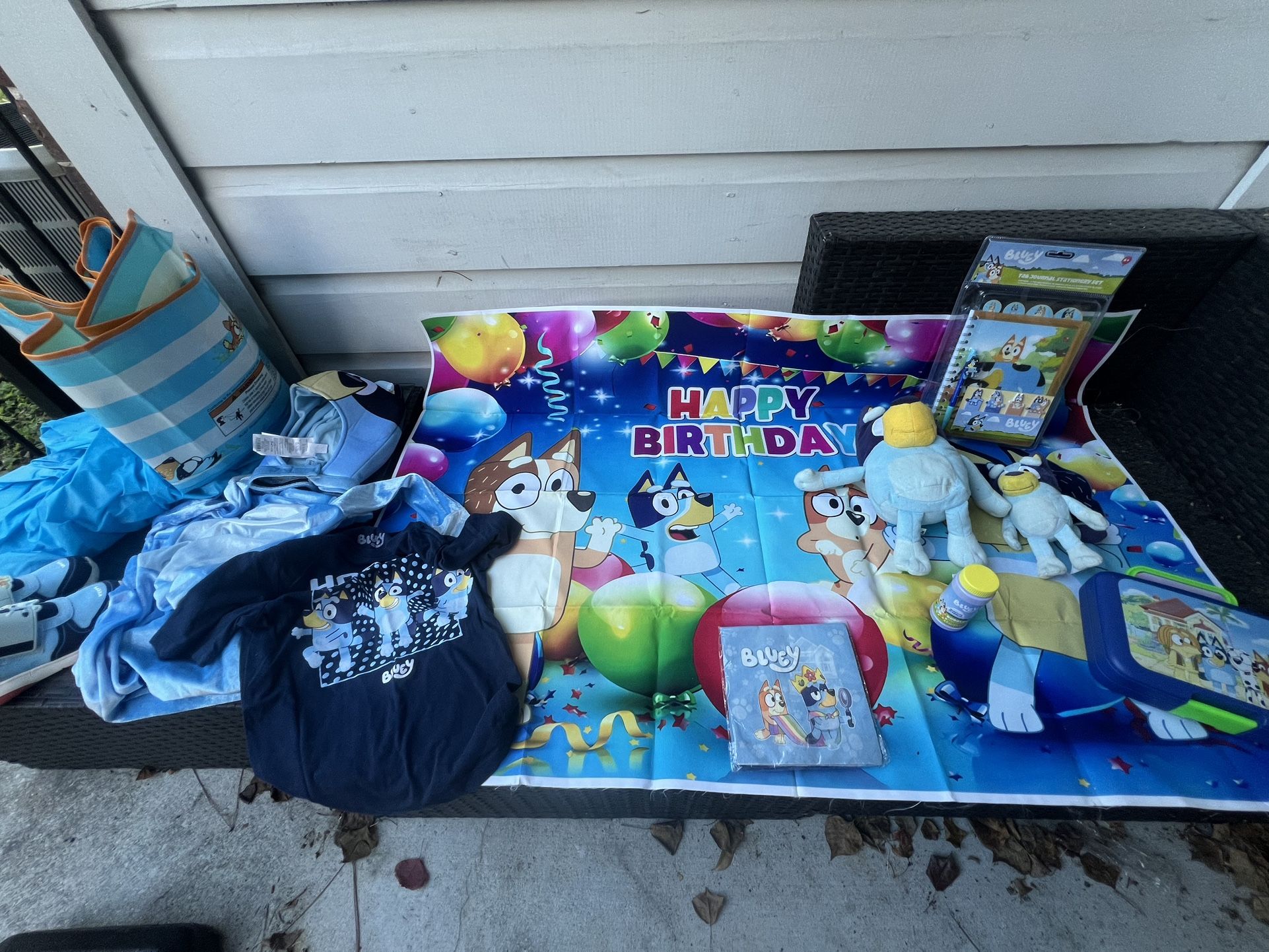 Bluey Bundle!! Comes with everything that’s in photos! Everything is a Bundle $40.. everything is in good condition 1 bluey birthday backdrop 1 pack of bluey napkins Bluey Halloween costume size 3t/4t Bluey backyard pool 2 bluey plushies Bluey bubbles Bluey shirt size small Bluey shoes size 12c/ lights still working on them Bluey notepad Bluey toy carry