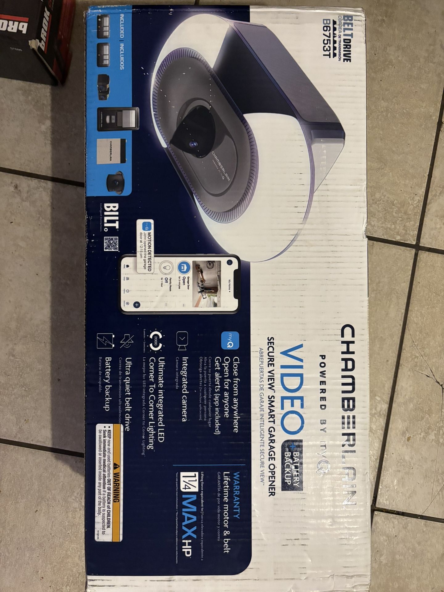 Chamberlain garage door opener with built in camera powered by MyQ 1 1/4 max horsepower Battery backup Close and open from anywhere open for anyone with the app on your cellphone Built in corner to corner LED lighting Camera has motion detection so you can be alerted on your phone when motion is detected