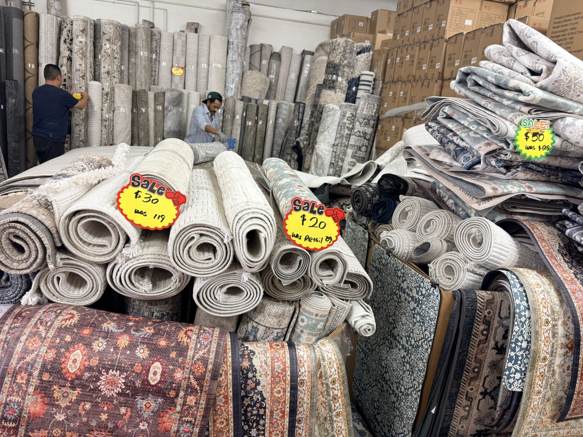 Brand new and opened sample rugs from Costco Price varies depending on size and brands 5X7 solid colors $30 8x10 solid colors $60 Persin Persian rug $80 9x13 $120-150 Bath rugs and Foam Rugs $15 Prices varies depending on sizes and conditions Welcome to check Our store address is 5118 Holt Blvd Montclair CA 91763,Today hours 11:00-4:00. Back door pick up