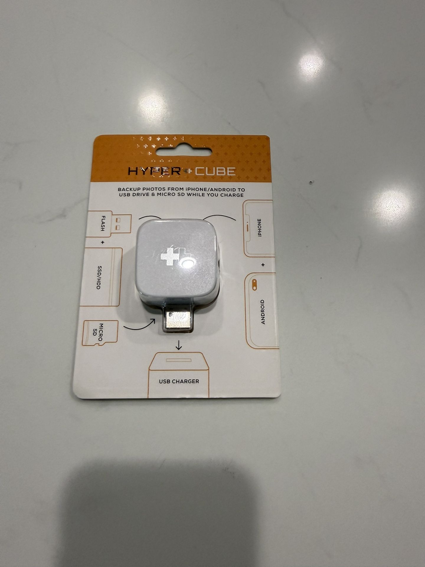 New HYPER + CUBE. This little gadget is super handy for backing up all your photos and videos from your iPhone or Android phone. You can save them to a USB drive or Micro SD card, all while your phone is charging. Connects right between your USB charger and phone. Also has a free app for iOS and Android.