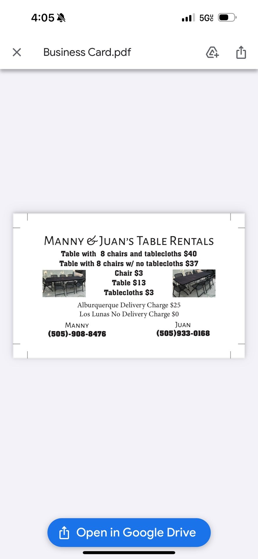 Renting tables and chairs very comfortable chairs no delivery to Los Lunas Albuquerque delivery charge of $25 there will be a $25 charge if not returned clean