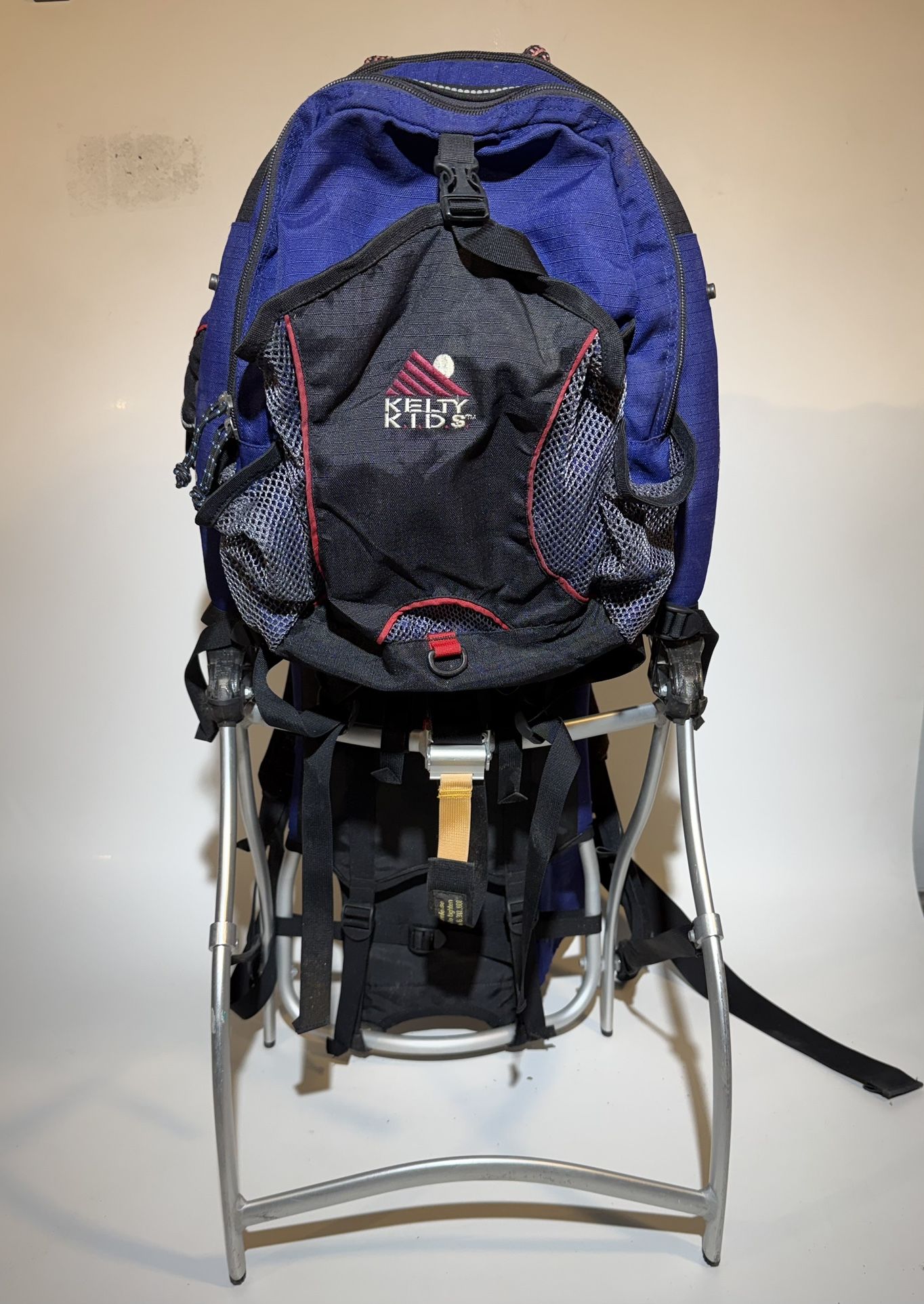 Kelty Kids framed child carrier backpack for hiking, walks, and travel. Sturdy aluminum frame with adjustable straps and multiple pockets for gear. Great for babies/toddlers who can sit up. Features: Kelty Kids branded carrier Lightweight frame with stand for easy loading Adjustable harness/straps and hip belt Storage pockets and mesh side pockets Color: blue/black