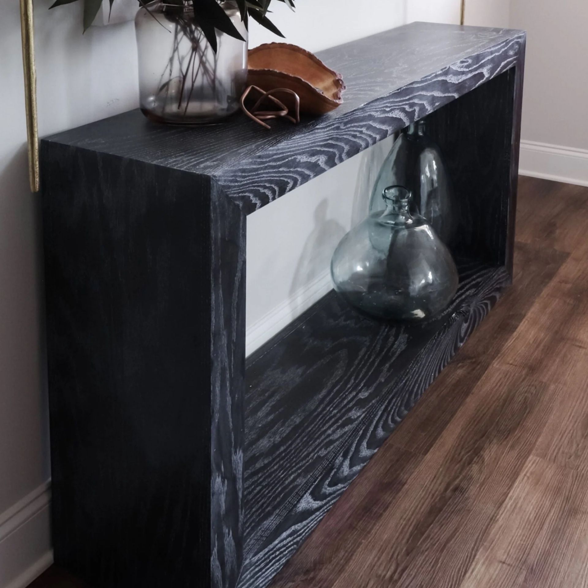 OFFERS ACCEPTED Vintage piece repurposed to a modern piece Add character and warmth to your space with this handcrafted rustic wood console table. Made from solid wood with a beautifully textured grain, this unique piece features a torched, distressed finish that brings out natural patterns and a rich, dark tone—perfect for modern farmhouse, industrial, or minimalist interiors. Its sleek rectangular frame is ideal for use as an entryway table, hallway bench, media base, or accent shelf. Style it with candles, plants, or family photos for an instant statement. The piece is sturdy, one-of-a-kind, and has a timeless appeal. Details: Solid wood construction with deep grain pattern Hand-finished in a dark, charred wood tone Minimalist open-box design Great as a console, bench, or display table Dimensions (approx.): [Insert measurements if available] Gently used and in excellent condition Bring home this stylish and functional piece that blends rustic charm with modern edge.
