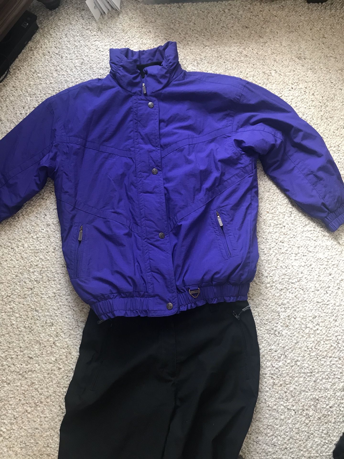 Just REDUCED TODAY!! Designer great brand Ski coat size 6 but lots of room vintage color 24.99. Beautiful color and only worn once!! Black ski pants size 10 . European made excellent waterproof . 14.99. Almost new too!! 🌷 Great outfit normally would cost u 200.00