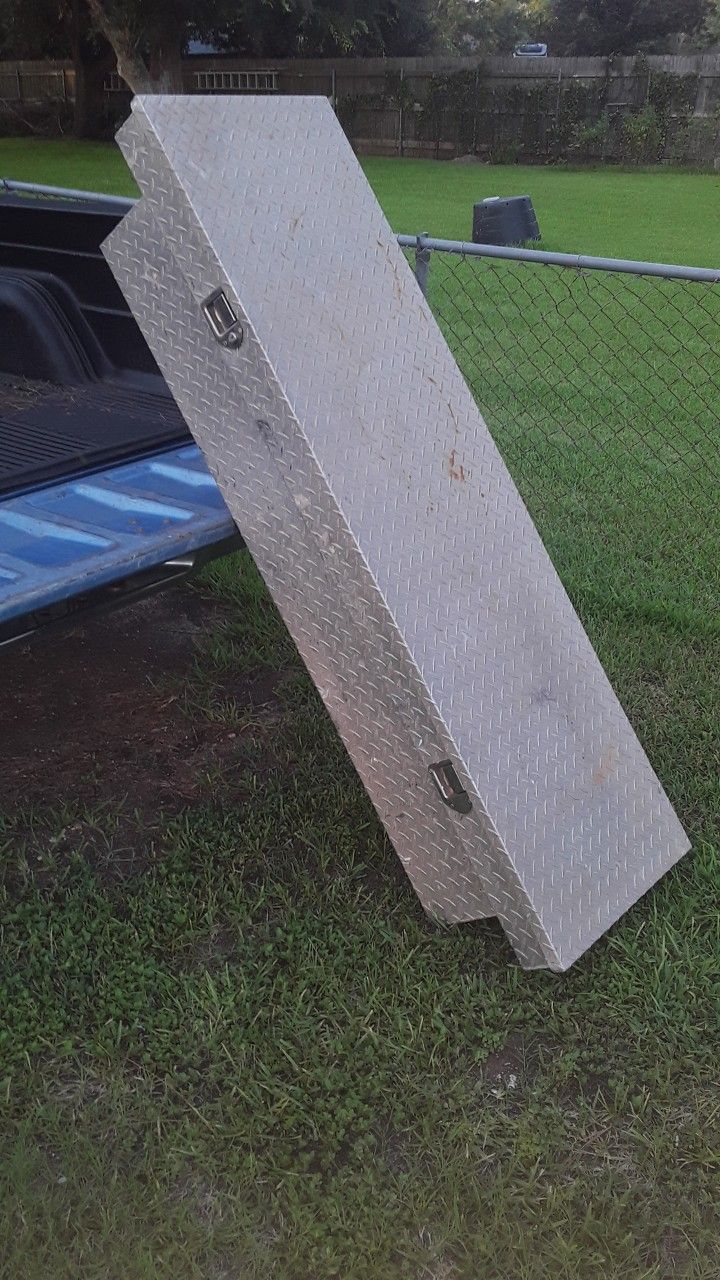 Standard size aluminum tool box. Hinged with 2 handles. Bolted in. Priced to sell. If interested, please leave your number. Thank you.