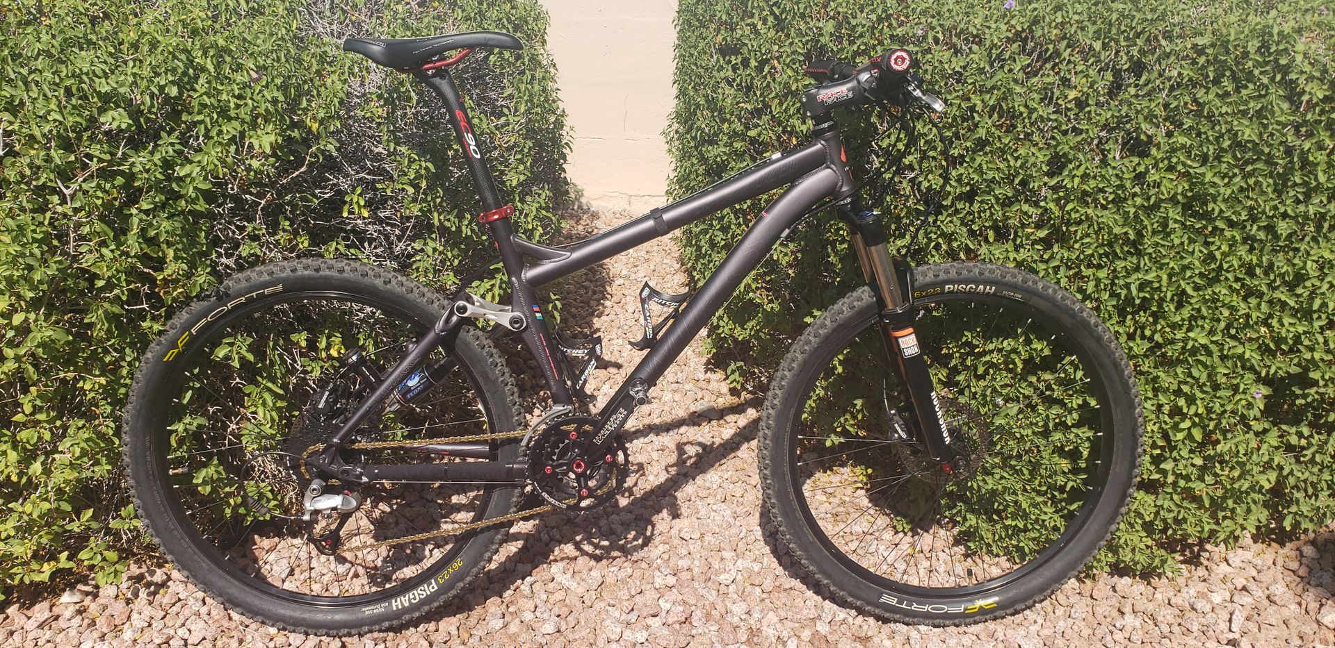 In near new cond...frame has some slight wear but excellent..I rebuilt this cross country bike during wrist surgery and was never able to get back on..tons after market,ton carbon fiber..really nice light race bike...trade for jon boat..alum boat..