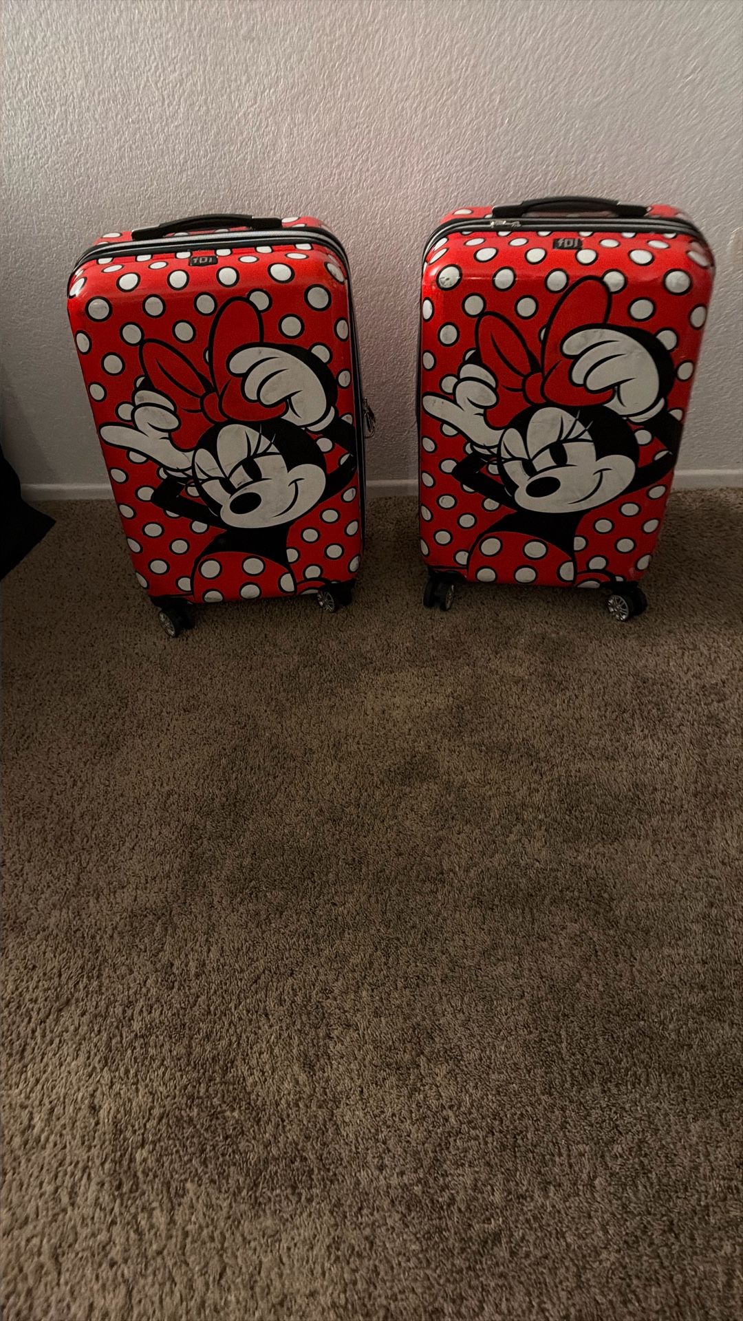 Minnie mouse suitcase I have two of them. They have been roughed a little from the airport but still an excellent condition. My daughters grew out of them so we had to get them big ones. They are from Kohl’s. I really love them clean inside. The tires are good like I said I have two of them. some minor scuffs on the outside one has a dent in the corner from the airport but other than that they’re in good condition. I purchased them from Kohl’s about five years ago
