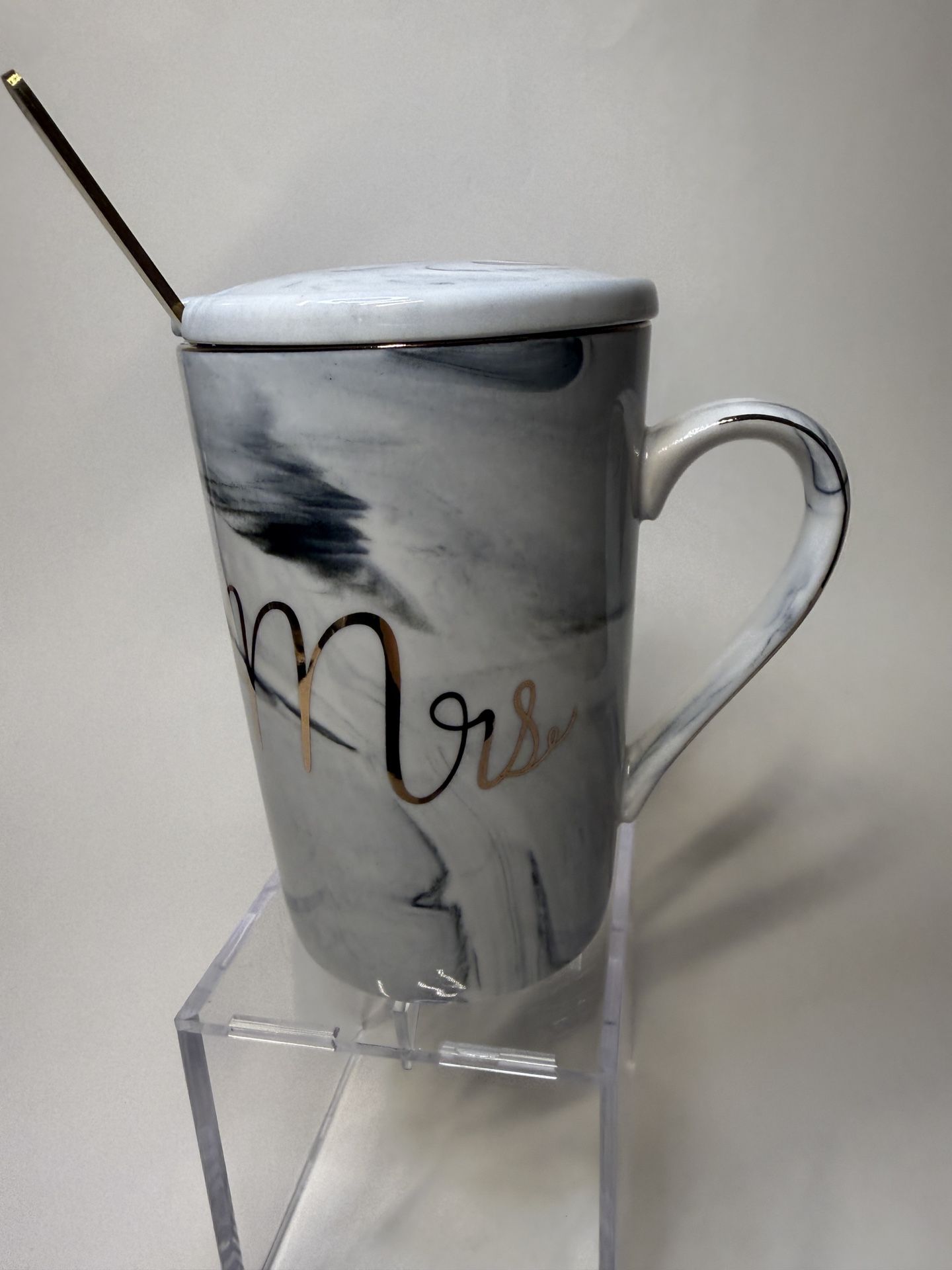 Marble-style ceramic “Mrs” coffee mug with matching lid and gold-tone spoon. Neutral gray/white marbled design with gold lettering. Great gift for a newlywed, bridal shower, or everyday coffee or tea. Received as a gift, never used. Stored safely but not in original packaging. No chips, cracks, or damage.