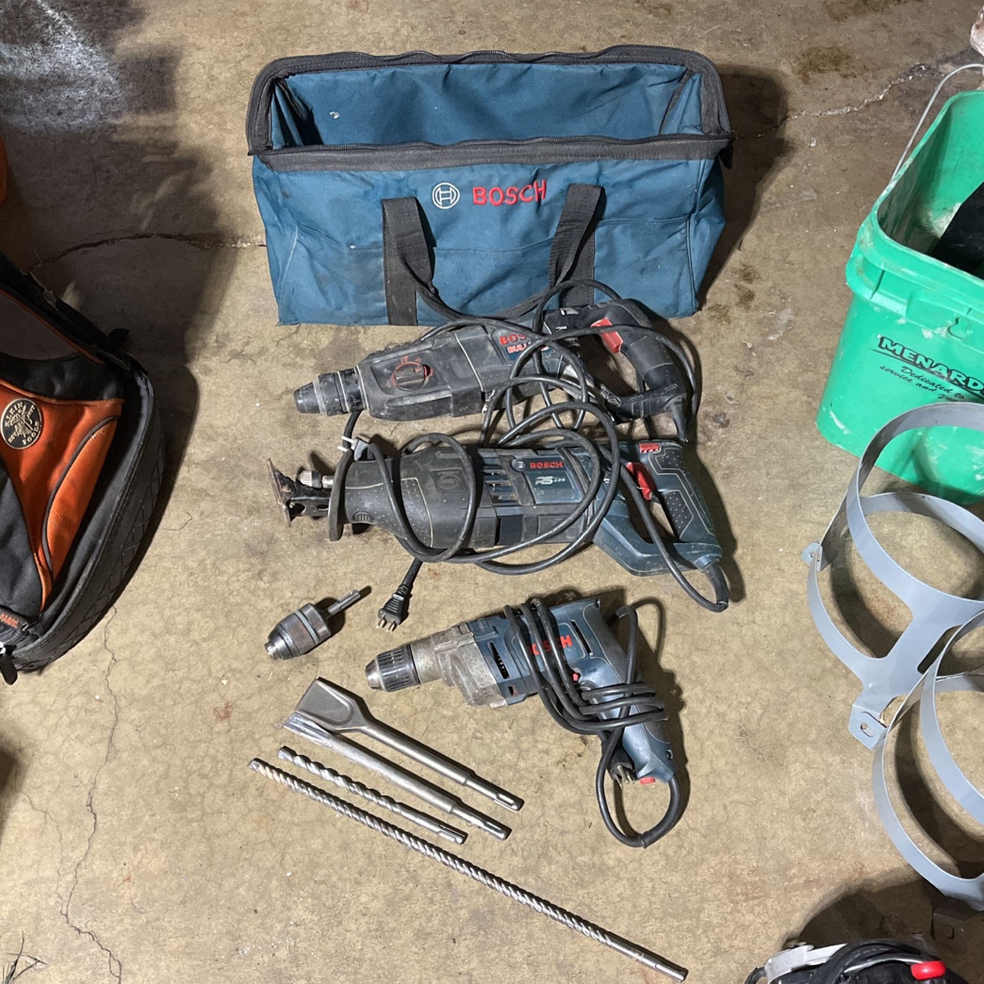 Hammer drill bulldog extreme SDS bits RS 428 orbit sawzall 3/8 chuck drill (2) masonry bits 3/8 x 6 and 3/8 x 16 3/4 chisel 1–1/2 chisel new Attachment chuck for hammer drill to use regular drill bits. $300 for everything with bag