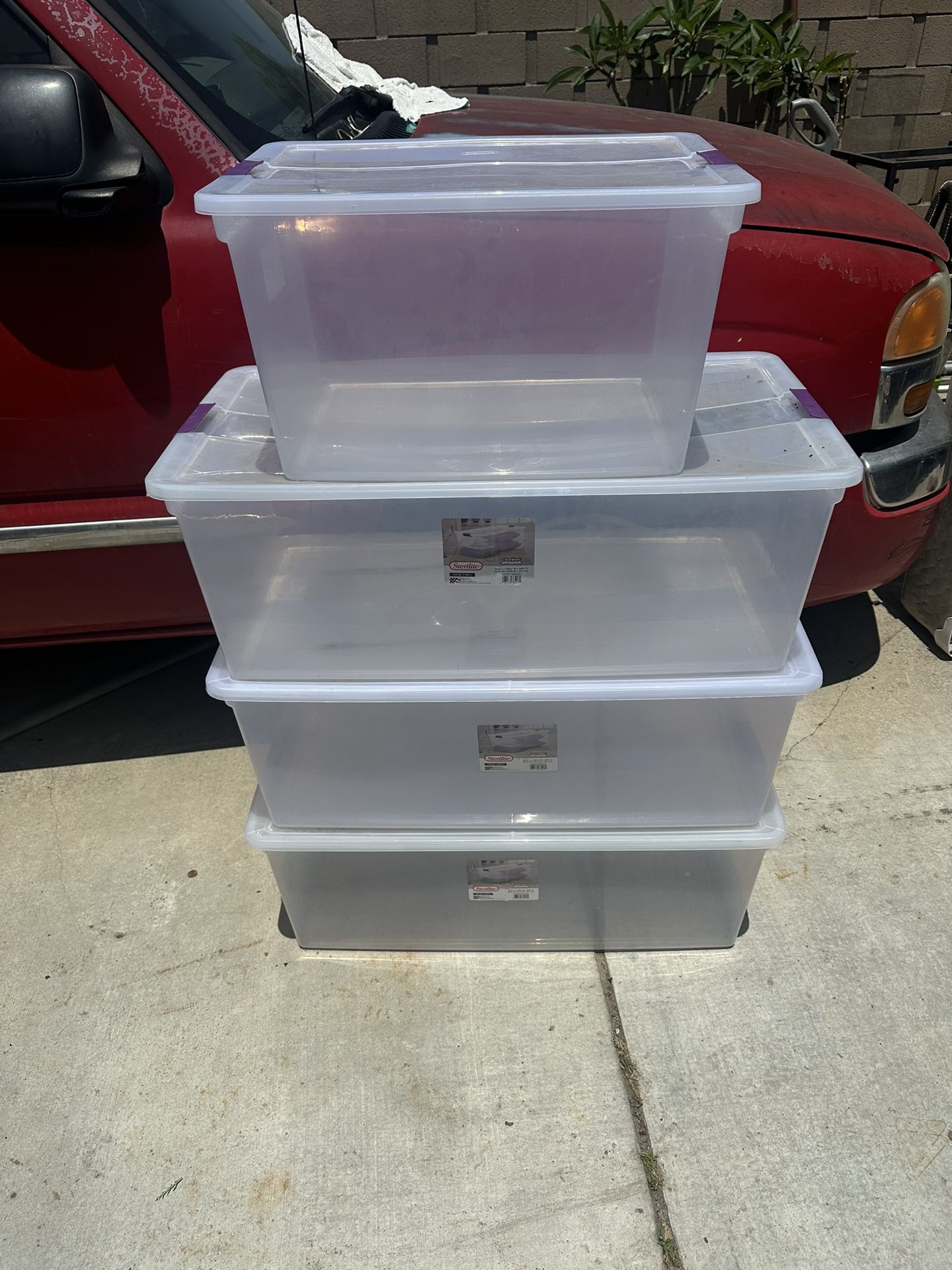 4 Clear Sterilite 66 Qt Totes Storage Containers W Lids Preowned Not more, but good condition Just dusty No cracks all lids included Sold as is
