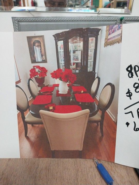 8 pieces 6 chairs table with cabinet. All in excellent condition. Available for Thanksgiving Will separate cabinets $300 from table and chairs $688