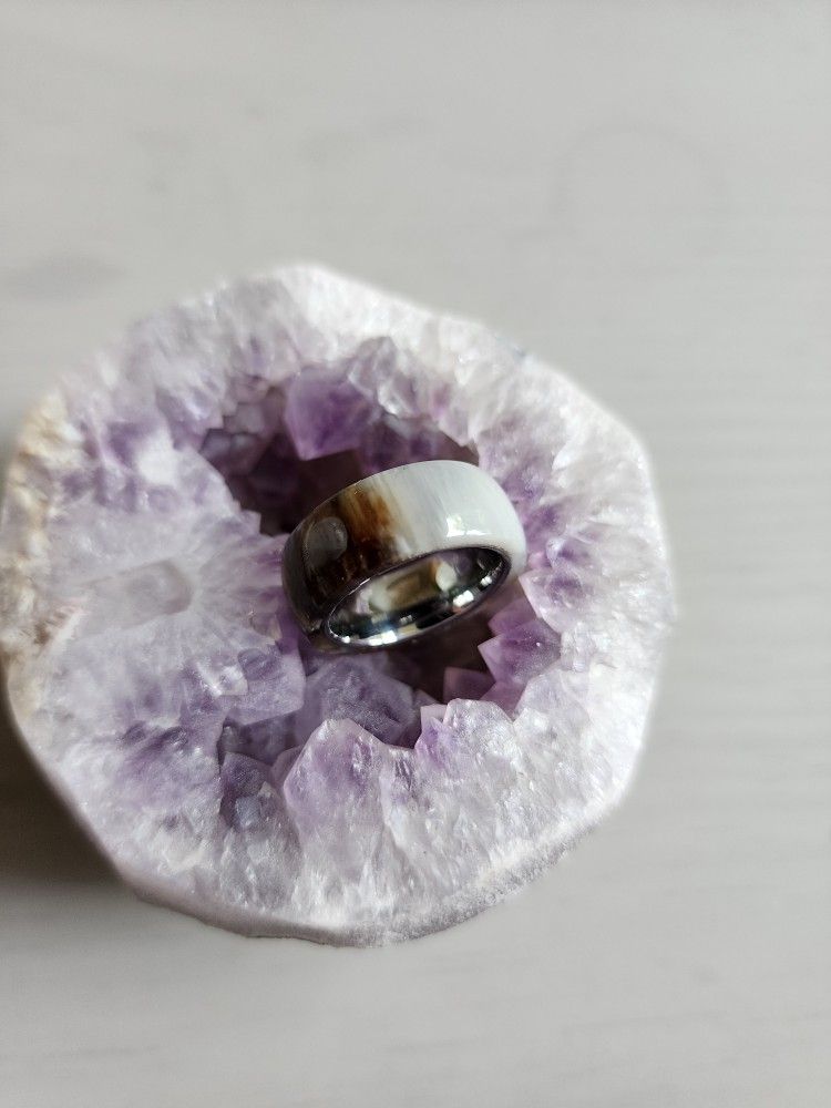 Beautiful opalized petrified wood on titanium band ring Size 6
