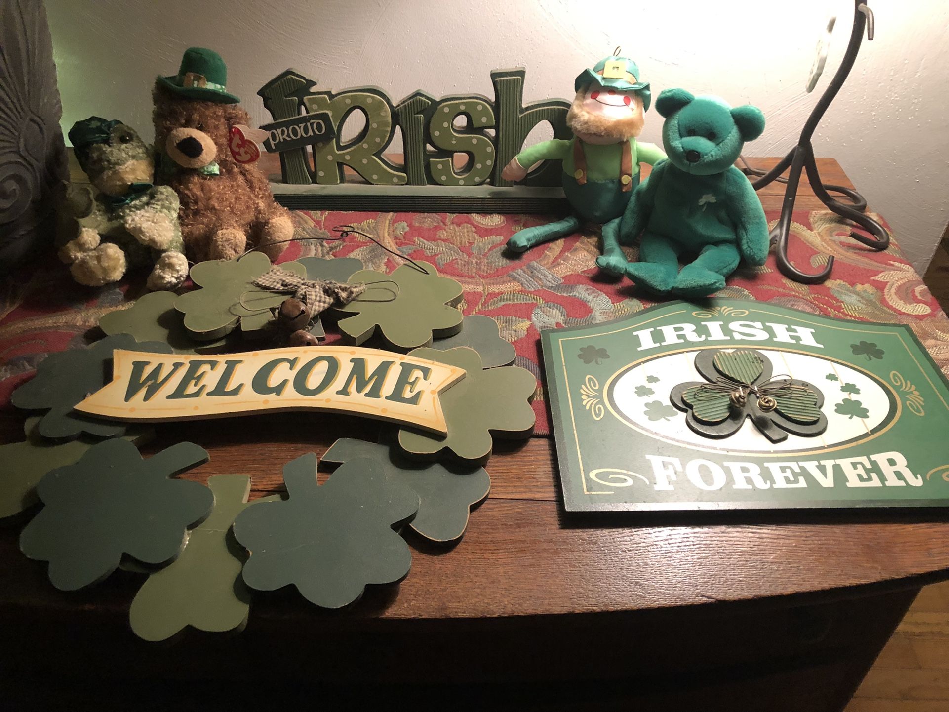 Everything you need to decorate for St. Patrick’s Day. A welcome wreath, an Irish forever sign and a proud to be Irish sign. Erin the beanie baby has no tag but Lucky O’Day has a tag…You are also getting a leprechaun and a frog from Dan Dee collectors