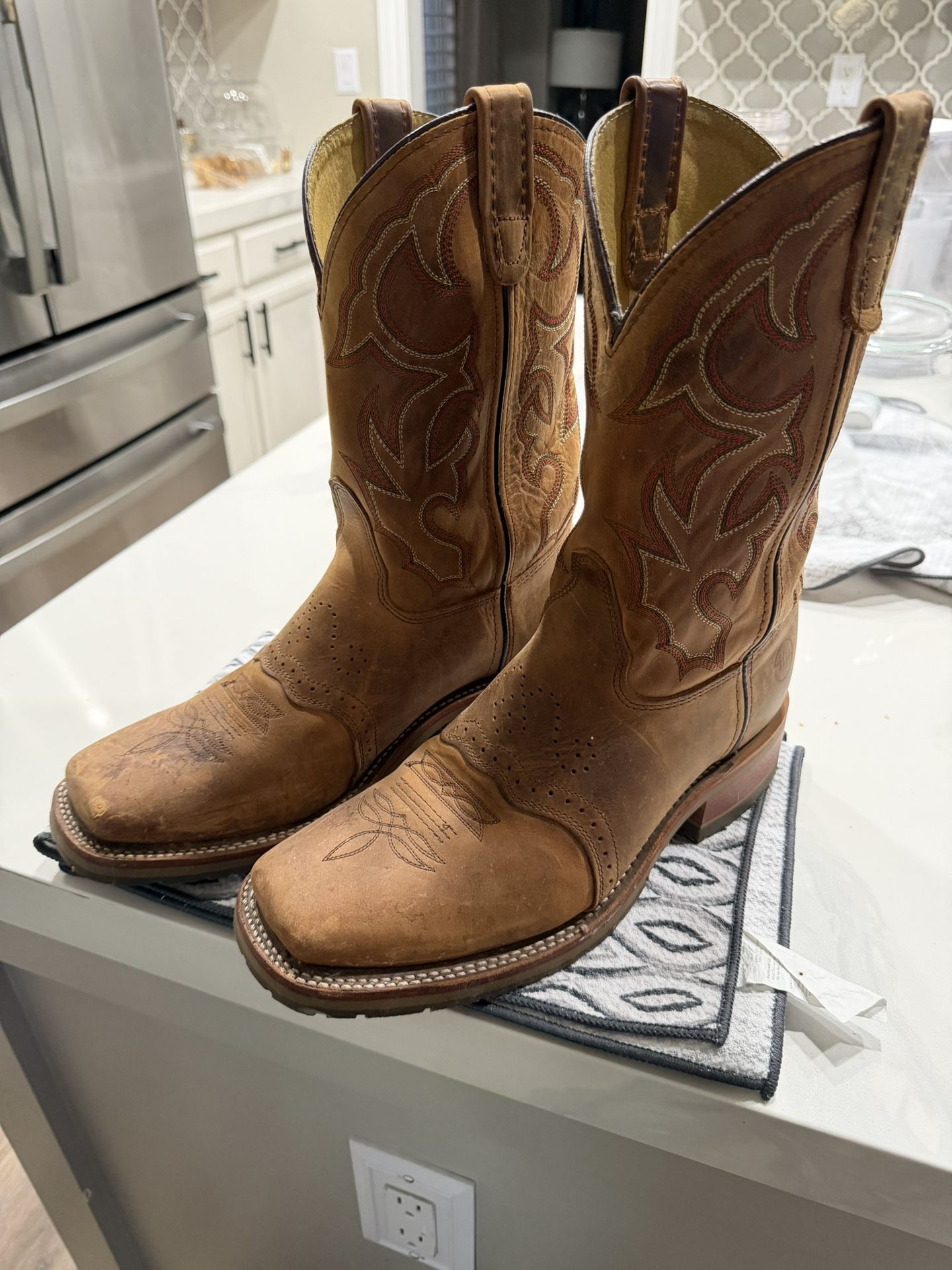Worn boots but still in really great condition, size is too small for me. They are an 11 D men’s boot.