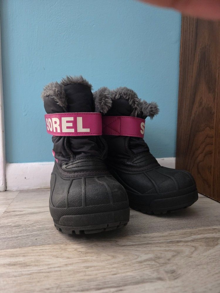 These Sorel winter boots are black with pink accents and a faux fur lining. They're great for keeping little feet warm and dry during cold weather. The boots feature a durable rubber sole for traction.
