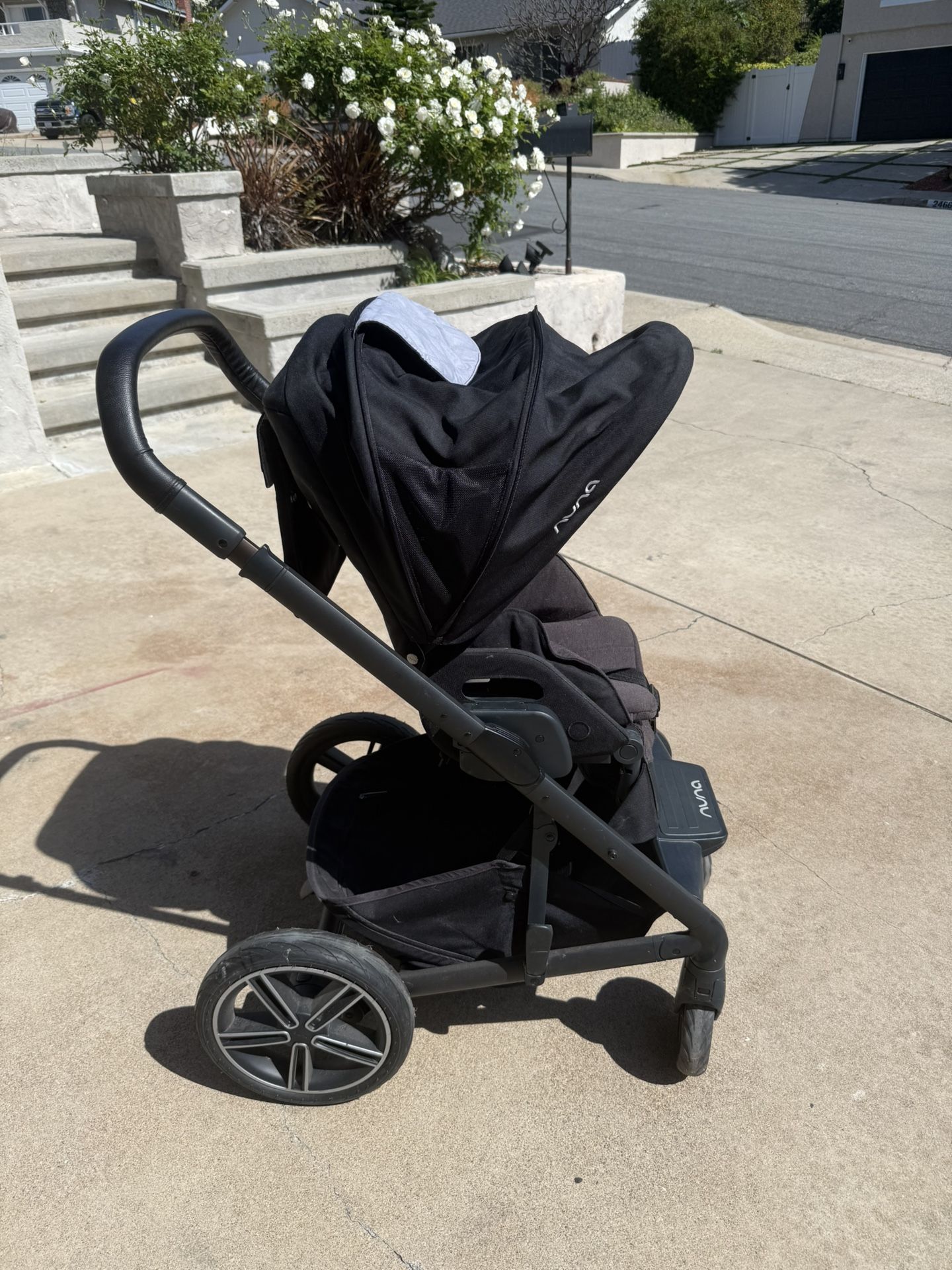 Stylish Nuna stroller. Black color. Has adjustable handle. Has a canopy. Big storage basket underneath. Comes with the gray padded seat insert. Great for walks.
