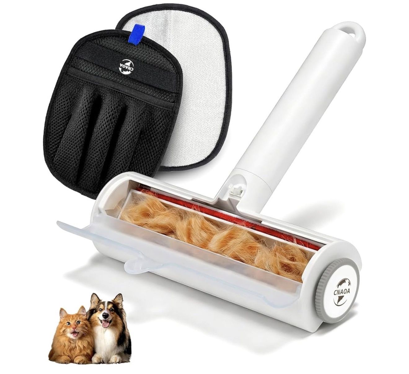 CNAOA: Pet Hair Removal Set, Roller Pet Hair Remover, Pet Hair Removal Glove for Dogs & Cats, Pet Fur Remover for Clothing, Couch, Carpet, Car Seat, Pet Hair Removal Tool -I White 2-IN-1 PET HAIR REMOVER, GLOVE + ROLLER - Get the best of both worlds! This CNAOA pet hair remover set includes an electrostatic five-finger glove and a reusable lint roller, designed to tackle pet fur anywhere, from your clothes to your couch and car seats. Say goodbye to messy fur and enjoy a cleaner home in minutes UPGRADED GLOVE, BIGGER COVERAGE & COMFY FIT - Our upgraded glove features a larger 9.45" x 7.09" surface with dense electrostatic bristles that attract and lift hair effortlessly. The five-finger design offers better grip and control, while the breathable mesh keeps your hands comfortable during use. Includes a hanging hole for easy washing and drying DETACHABLE HANDLE ROLLER, COMPACT - The reusable lint roller features a 7.48" x 2.48" cleaning surface for quick, efficient fur pickup. Its detachable handle design makes it easy to store or travel with, perfect for on-the-go cleaning in your car or office. Lightweight yet powerful, your must-have tool for every pet owner REUSABLE & ECO-FRIENDLY - No more wasteful sticky sheets! Our gloves are washable, and the roller is super easy to clean—just take out the collected hair and wipe it off to reuse. A simple, eco-friendly way to clean that saves you money and helps the planet WORKS ON ALL FABRICS - Perfect for clothes, sofas, bedding, carpets, and car seats [Multiple item: 2/2.] [Pick up only./Zelle is acceptable.]
