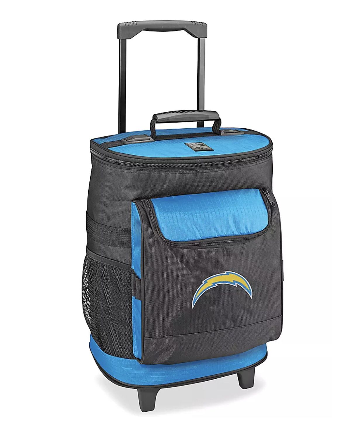 Nothing’s cooler than showing off your favorite football team. • Holds up to 30 cans or all your picnic supplies • two mesh side pockets and one zippered front pocket • Telescopic handle and durable wheels