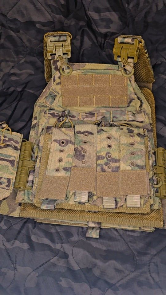 Brand new plate carrier with attachments. Comes with 4 pistol mag pouches and 9 rifle mag pouches. Has inside padding and spots for plates. Asking $160.