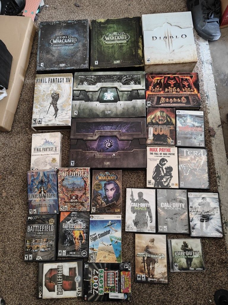 25 Computer PC Video games and 4 controllers. All boxes are in great condition and the game discs are in great condition as well. $350 for all. Cash or trades. Trades for PS1 games, Sega Master System games, Sega Genesis Games, Atari Jaguar and TurboGrafx games. Check out my other listings. Thank you.
