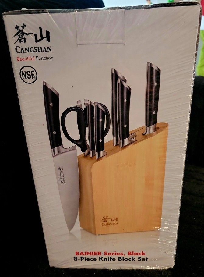 8-Piece Cangshan Rainier Series Knife Block Set black handles with wood block