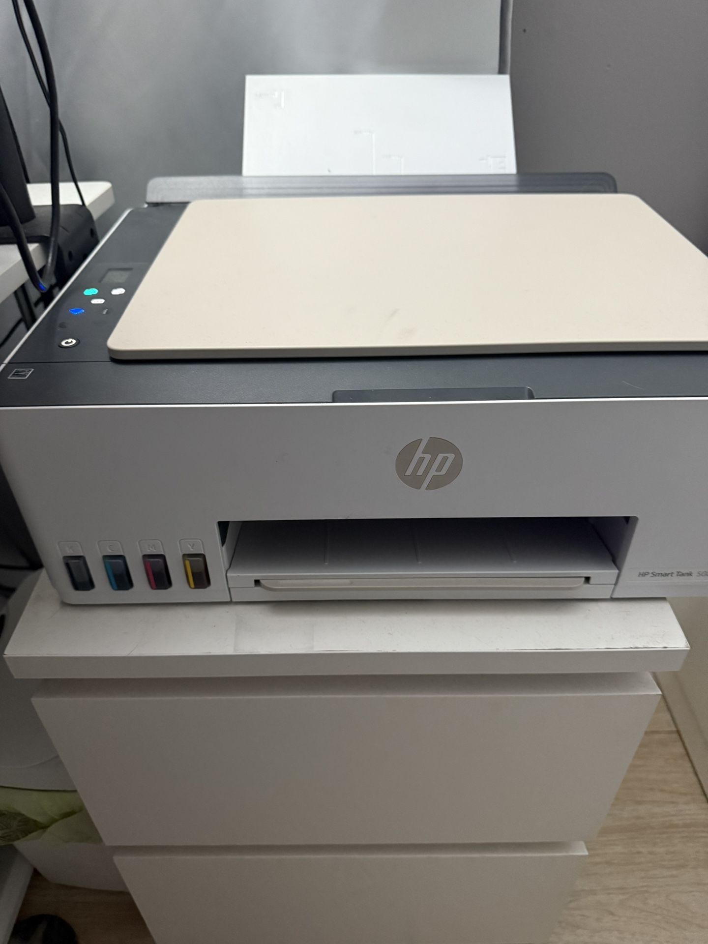HP Smart-Tank 5000 Wireless All-in-One Ink-Tank Printer mobile print, scan, copy, white, 17.11 x 14.23 x 6.19 Wireless connection or USB cable (cable not included) There is ink in the cartridges. Prints in color or black and white. Semi new condition, have used it for 3 months only.