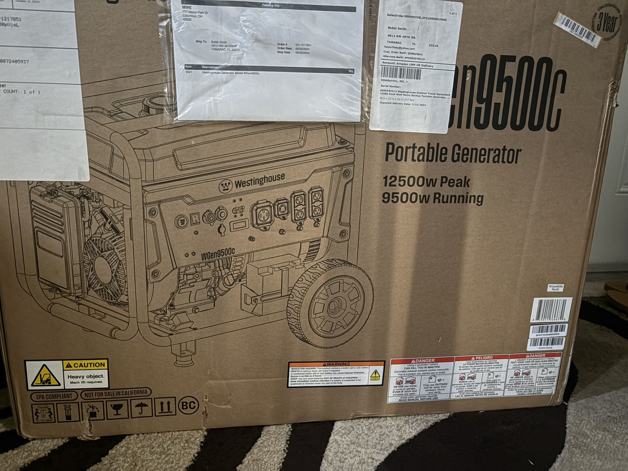 Brand new out of box never been used before. Westinghouse generator. Max output 12,500 watts Running 9,500watts Cable connection for house included.