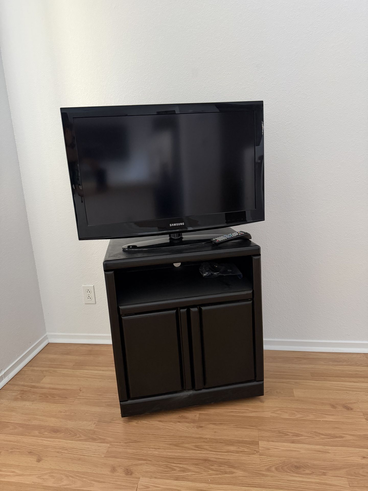 Black painted wood TV Stand and 32” Samsung TV with Roku.
