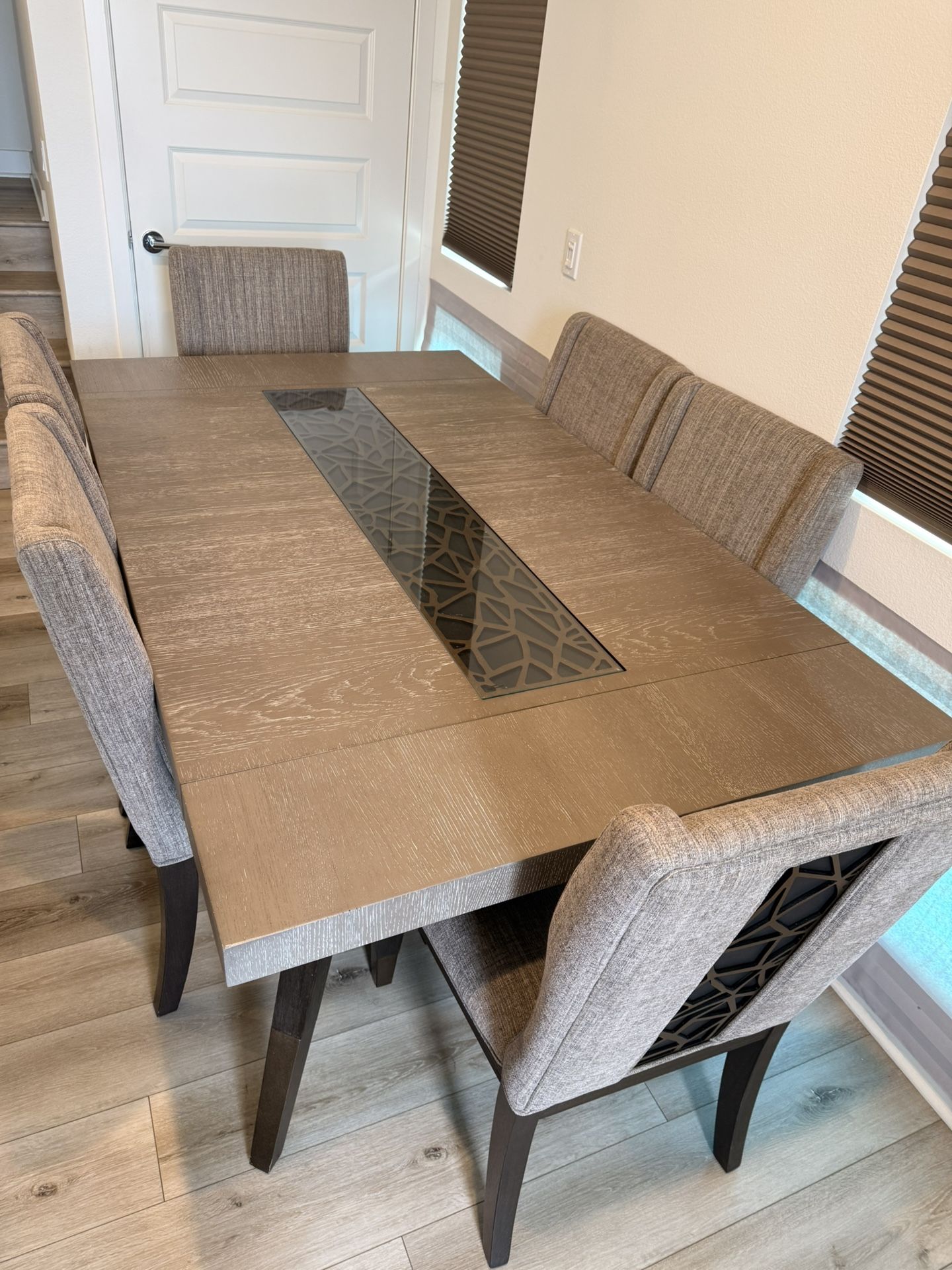 Currently retailing for 1949 + taxes and shipping at Jeromes. You can find the set on the Jerome's Furniture website here: https://offerup.co/faYXKzQFnY?$deeplink_path=/redirect/ Elevate your home with this stunning 7-piece designer dining set, a perfect fusion of modern architectural flair and warm, sophisticated textures. The centerpiece features a spacious gray-washed table anchored by an intricate geometric glass inlay, beautifully complemented by six premium upholstered chairs that boast striking gold-toned fretwork on the backrests. With its unique mix of wood, metal accents, and artistic patterns, this set offers a "gallery-style" aesthetic that is as much a conversation piece as it is a functional space for hosting memorable dinners.