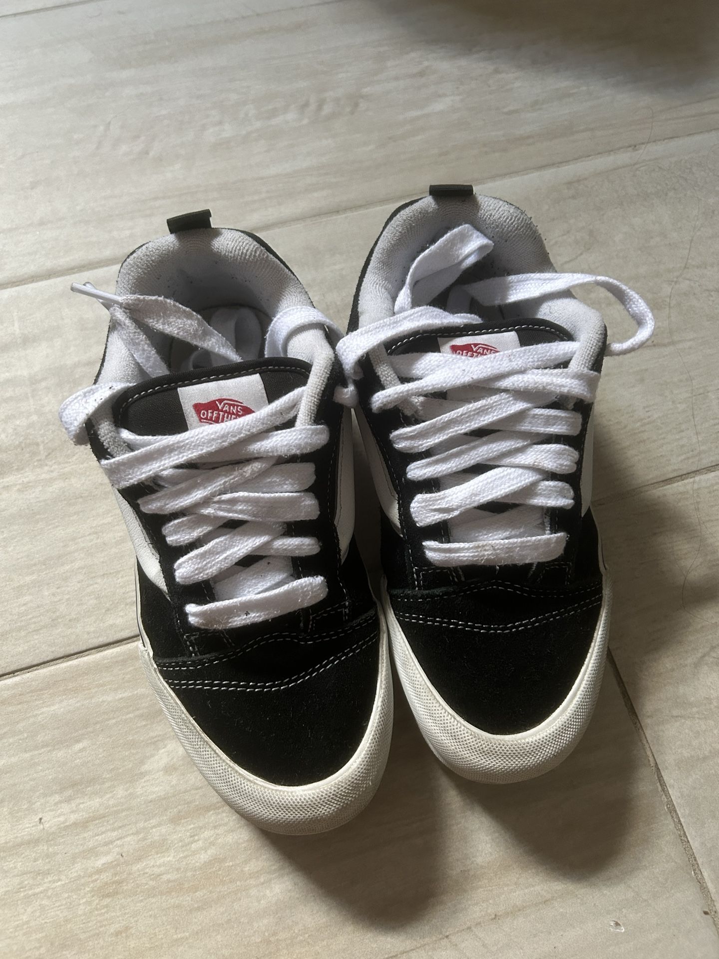 Black & white Vans Knu Skool. Worn but still in good shape, no holes or tears. Side are chipping. Great everyday/school shoes. Just don’t wear them anymore. Open to offers.