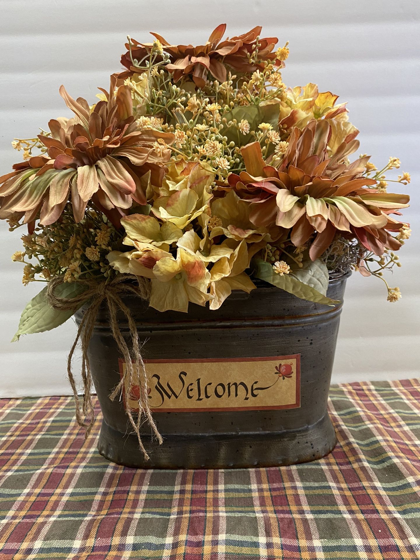 Metal bucket with handles and hydrangea and floral arrangement with moss, jute bow and “Welcome “ sign on front . Measures 16” tall and 12” wide, and 7” deep.